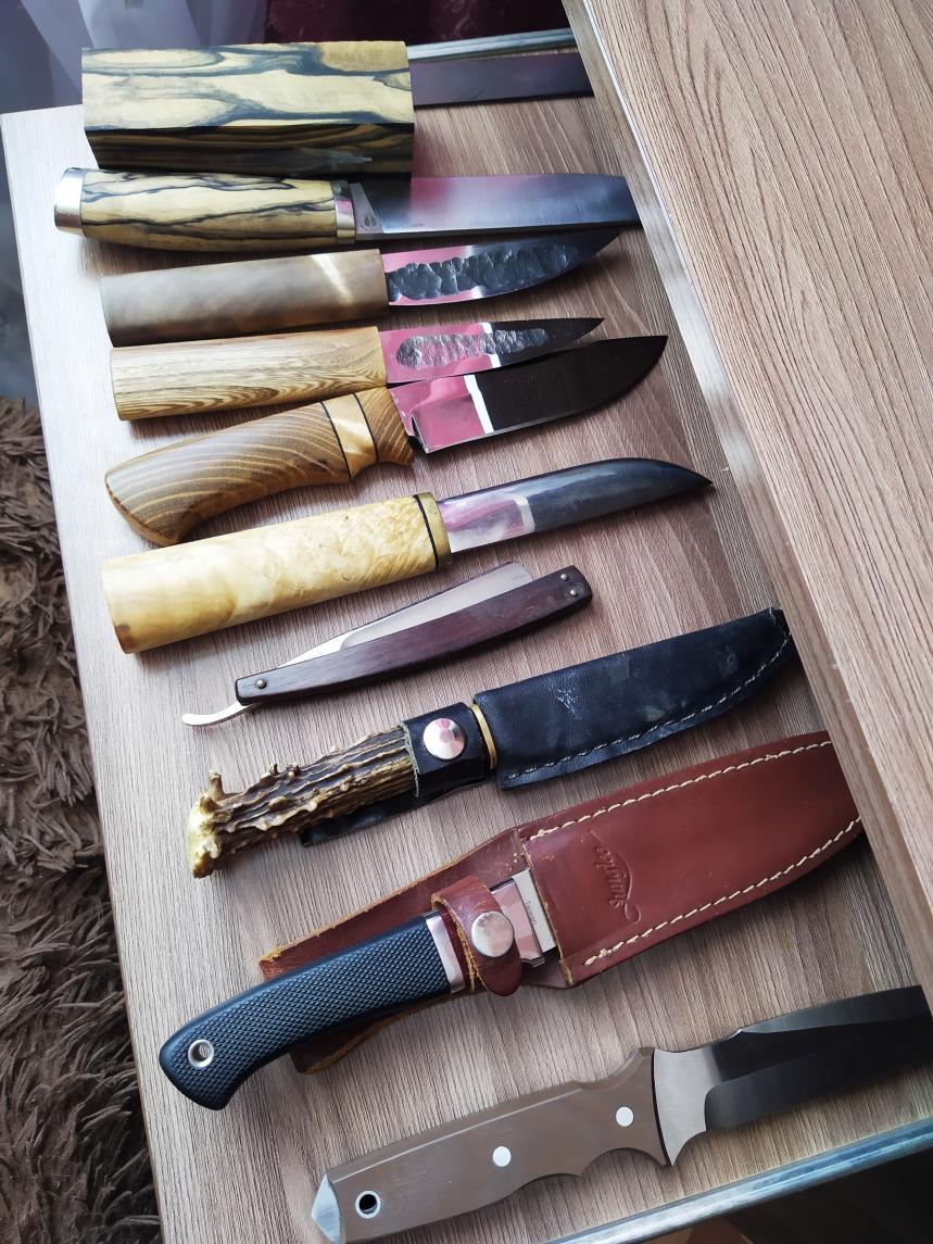 Exwomanizer, а много ли людей имеют ножи с рекурвой, или ромбики? Через мои руки проходят в месяц до 20 ножей. И за последний год полтора, я не припомню, чтобы были такие. Вот на данный момент у меня в работе, какие за ножнами, какие на переделку, и на изготовление. Но не одного с рекурвой или ромбом нет. IMG_20210215_121354.jpg