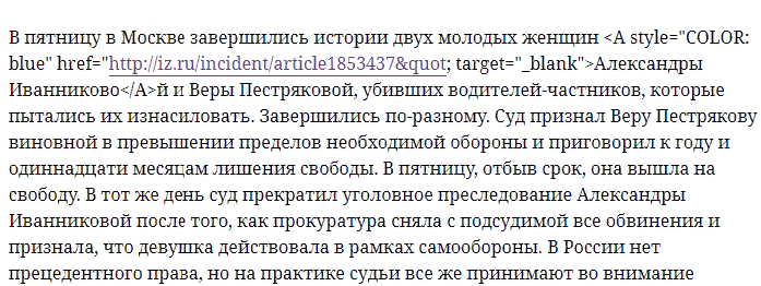 Если бы адвокат Иванниковой не подключил одно из националистических движений, создавшей шум, то Иванникова получила бы срок как и её предшественница Пестрякова. А так во второй инстанции прокурор (внезапно!) снял обвинение.