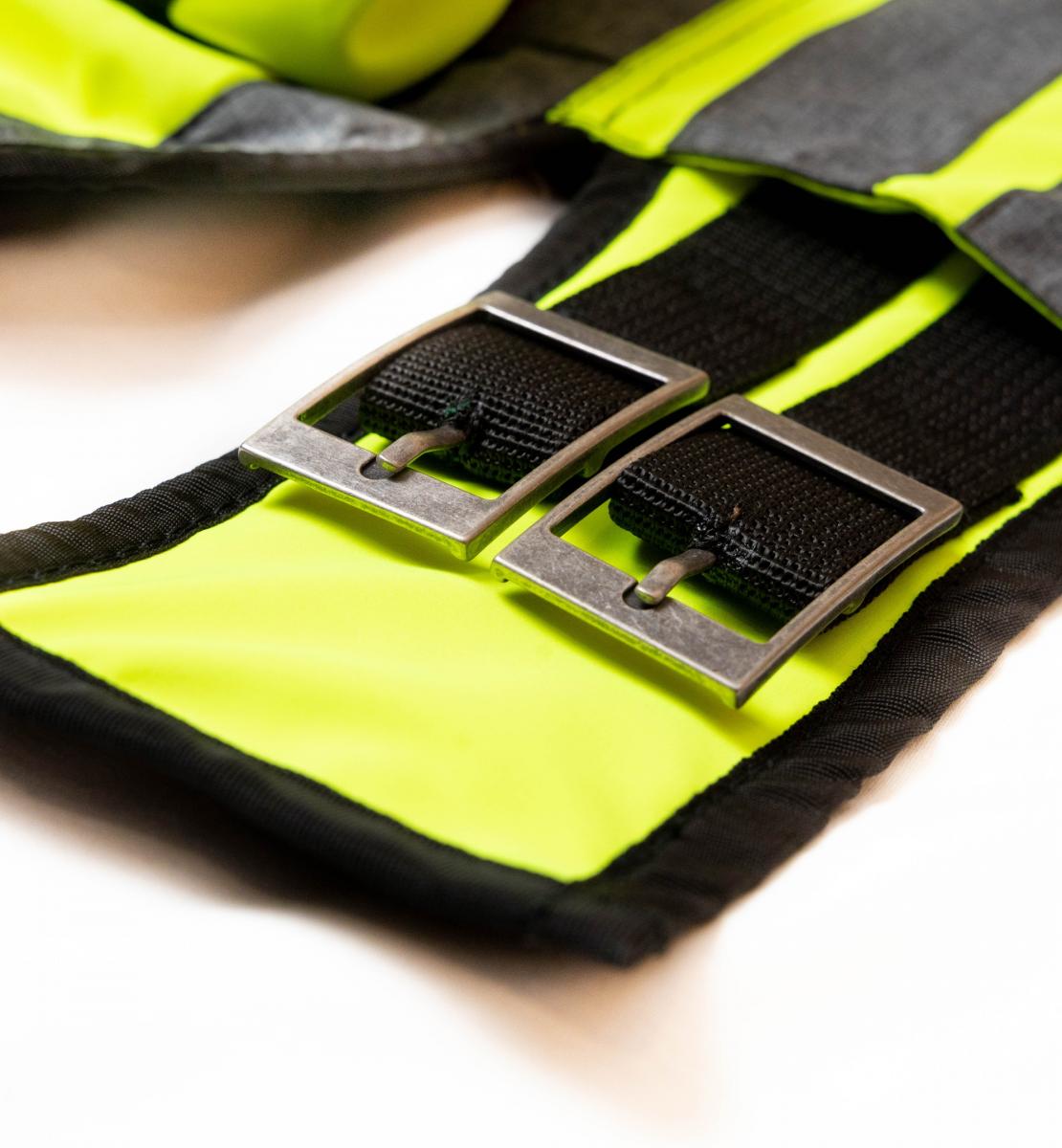 Снабжен всеми необходимыми комплектующими, такими как светоотражающая ткань, стропы, пряжки, воротник, рукава в виде лепестков, которые тоже сделаны из несколько слоев кевлара.