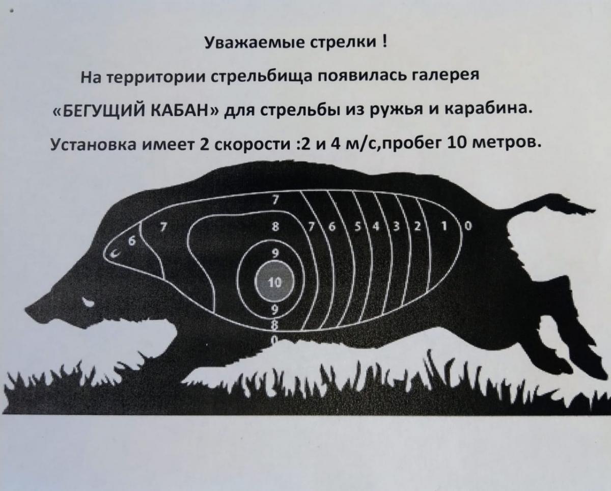 Установка имеет 2 скорости: 2 и 4 м/с, пробег 10 метров. Мишени «кабан» для стрельбы из ружья и карабина.