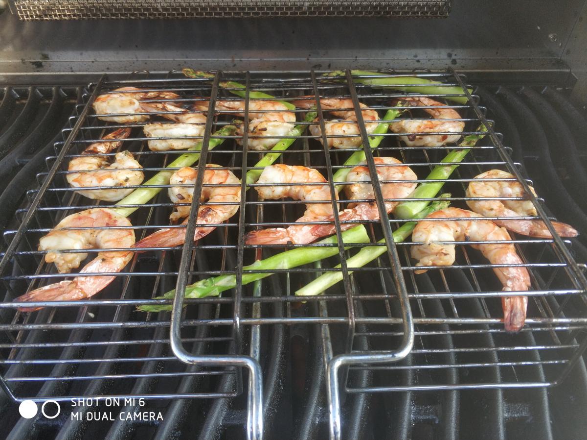 Если гриль с несколькими горелками (у меня вот например их 4), то прекрасно можно делать одновременно и мясо и креветки, запчасти от мертвых куриц и овощи, и все в таком роде.