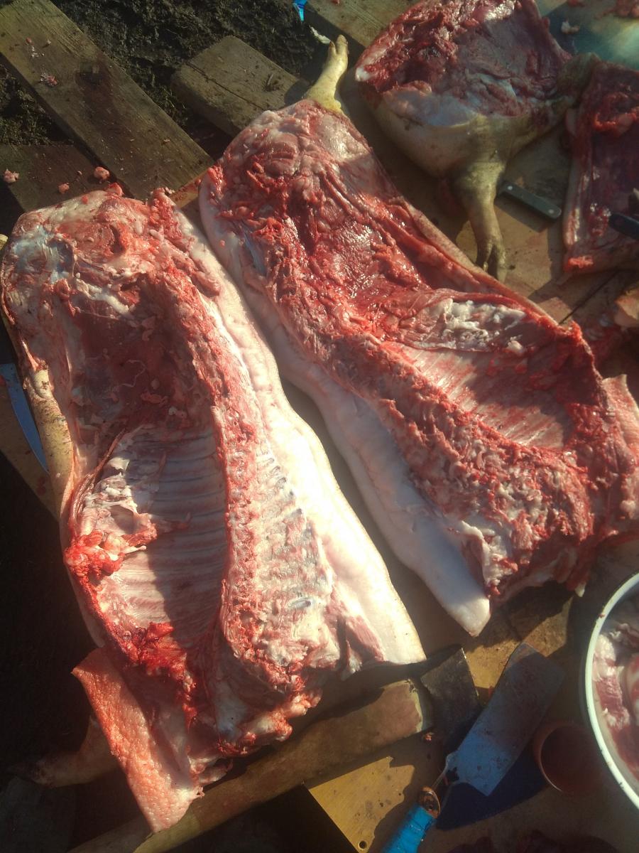 Полутуша, четверть - 400₽ за кг.. Позвоночник вырублен, без ножек. Если рулька не нужна - можно и её отрубить.