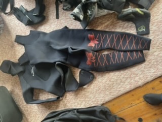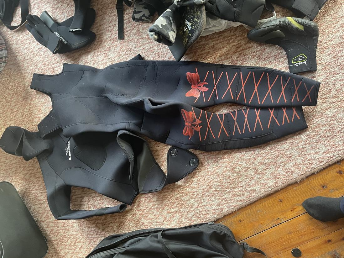 Костюму 3 года, открытая пора 7мм, надевался он 2 раза. Отдаю полным комплектом с перчатками и носками за 8000 рублей, состояние нового костюма. На груди крепление для ножа. Индивидуальный пошив на 46 женский размер со всеми особенностями строения женского тела. На штанах, забавы ради, акрилом нарисованы подвязки. Кроме того продаю абсолютно новые ботинки марки марес 37 размер,