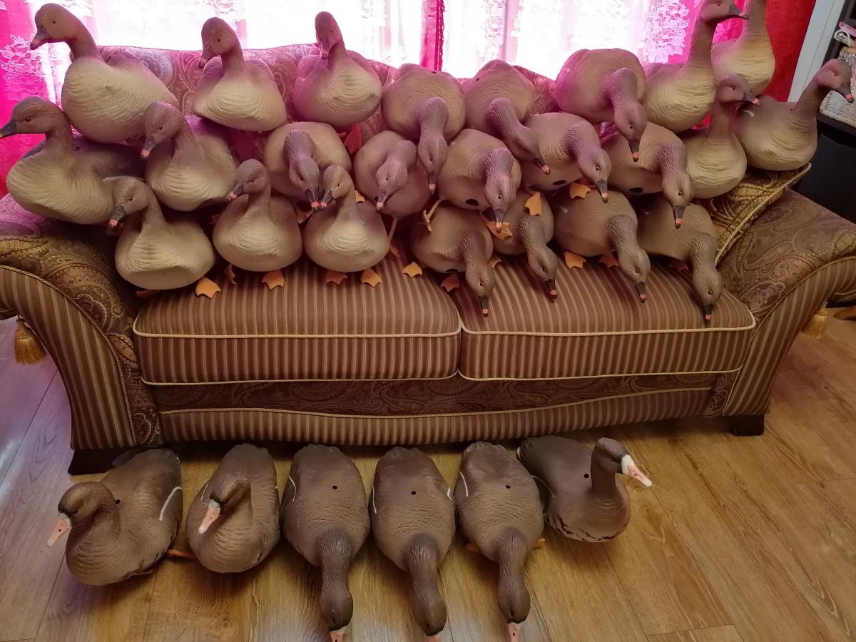 4 комплекта, 24 шт. гуменника (12 Кормящихся, 8 отдыхающих и 4 сторожа) и 6 шт. белолобых (3 кормящихся, 2 отдыхающих и 1 сторож). Куплены весной 2021 года (чеки сохранены), одна охота в поле. Чучела в идеале, краска как на новых, ноги и стойки все, хранились в подвешенном состоянии на даче, переносились в сумках.