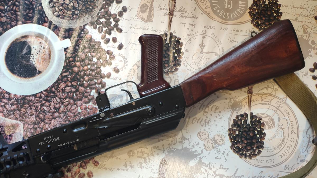 В комплекте или родное дерево, или алюминевое цевье в варианте под ту же Зенитку с китайской ручкой (мне так было удобно). Накладка на газтрубку - родное дерево в обоих вариантах.