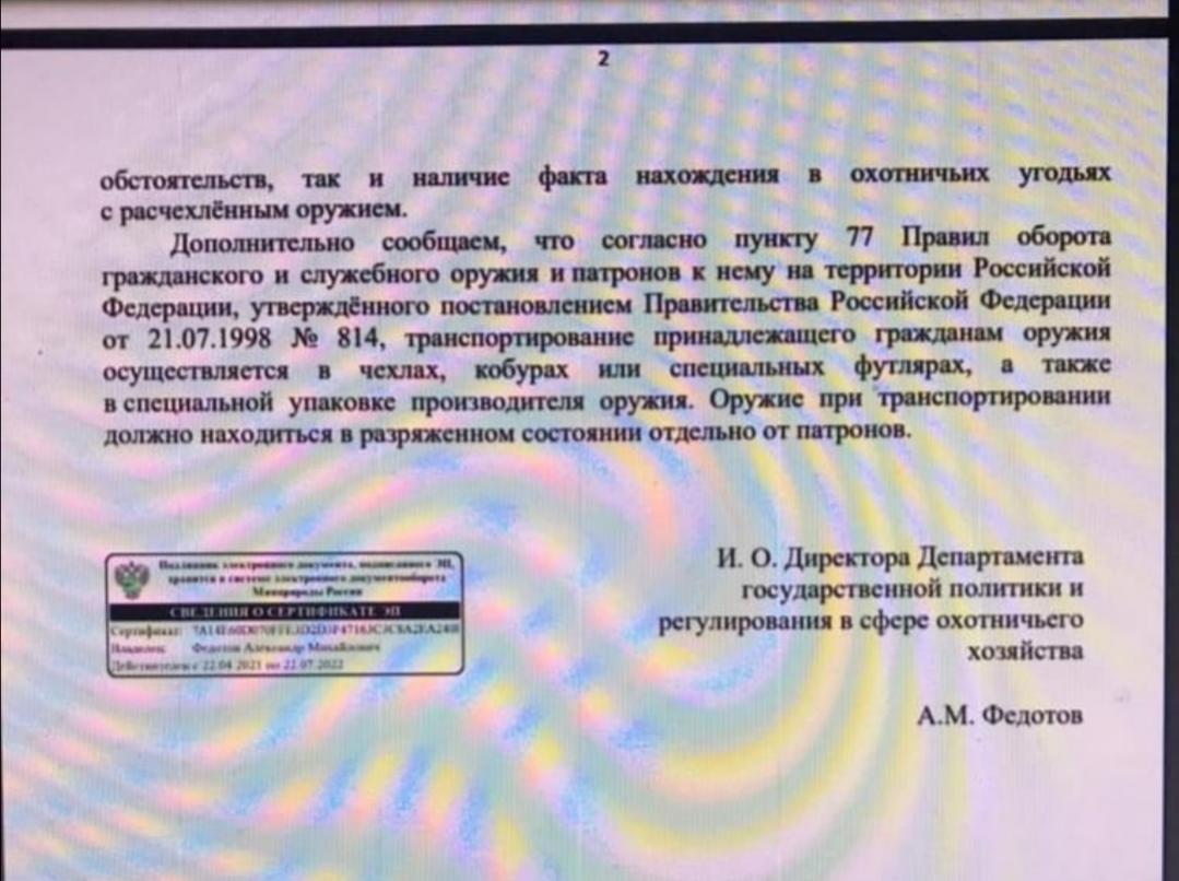 Неужели теперь так нельзя и заезжать предстоит ночью, чтобы первую утрянку не пропустить. И как же по темноте лагерь ставить, скрадки строить? Для выяснения этого вопроса написал в Комитет по охране, контролю и регулированию использования объектов животного мира Ленинградской области, который выдаёт разрешения на добычу в общие угодья. Также позвонил в ЛООиР (Ленинградское общество охотников и рыболовов). По телефону в обществе прокомментировали ситуацию следующим образом. Мол, в наших угодьях ничего не поменялось. Можно заезжать с зачехлённым оружием накануне открытия охоты. Ружьё в чехле, находится в машине, патроны отдельно в рюкзаке — никаких проблем не будет. А вот из Комитета ответили дословно следующее: