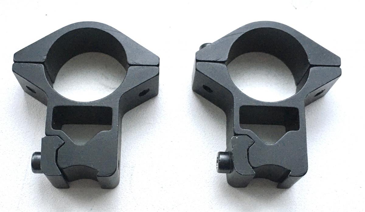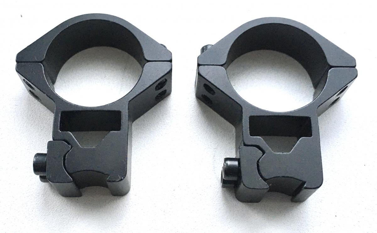 5. Кольца 30 мм на базу ласточкин хвост 11 мм, высота 20 мм, с прорезью для открытых прицельных, сплав. Крепление верхнего полукольца на четырех винтах-290 руб..