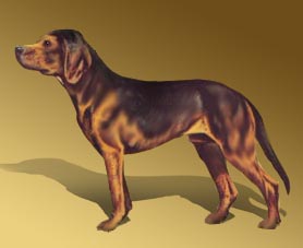 Чем то она напоминает мне кровяную гончую(ищейку),баварскую по моему...Попробуйте обратиться в Союз охотников,может кто потерял..