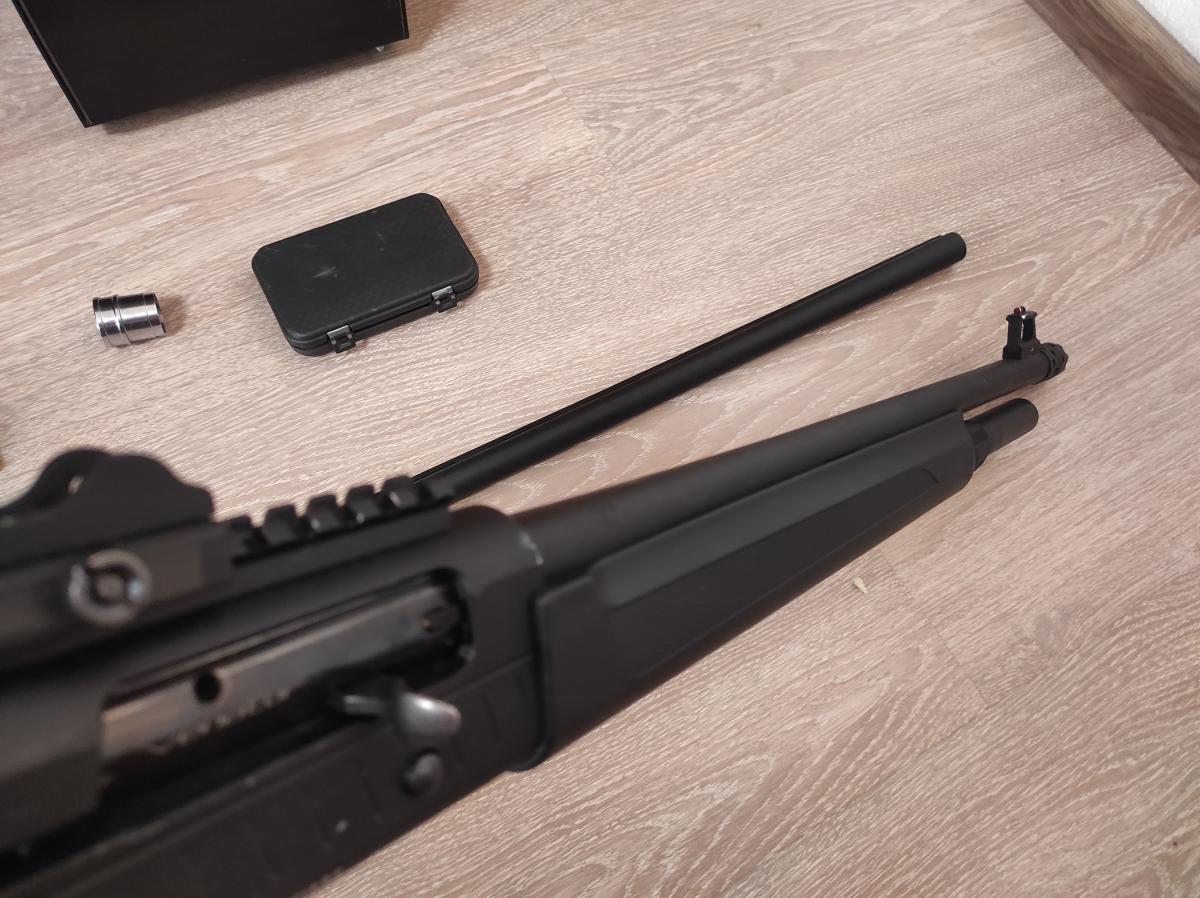 Комплект. Ружье. 5 чеков. Насадка удлинитель ствола 10см. Проставки. Второй поршень для стрельбы сверхтяжелыми навесками. Телескопический приклад. Пистолетная рукоять.