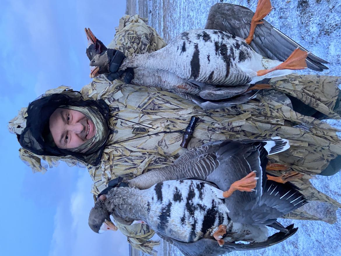 Погода совсем не рай. Охотимся между снежными и ветряными зарядами. За вечерку всего 2 налёта. Пара гумящей (выше) и стая белолоба (выбили 4 шт). Больше ни га-га. Вода в кастрюлях и в чайнике уже встала в лёд.