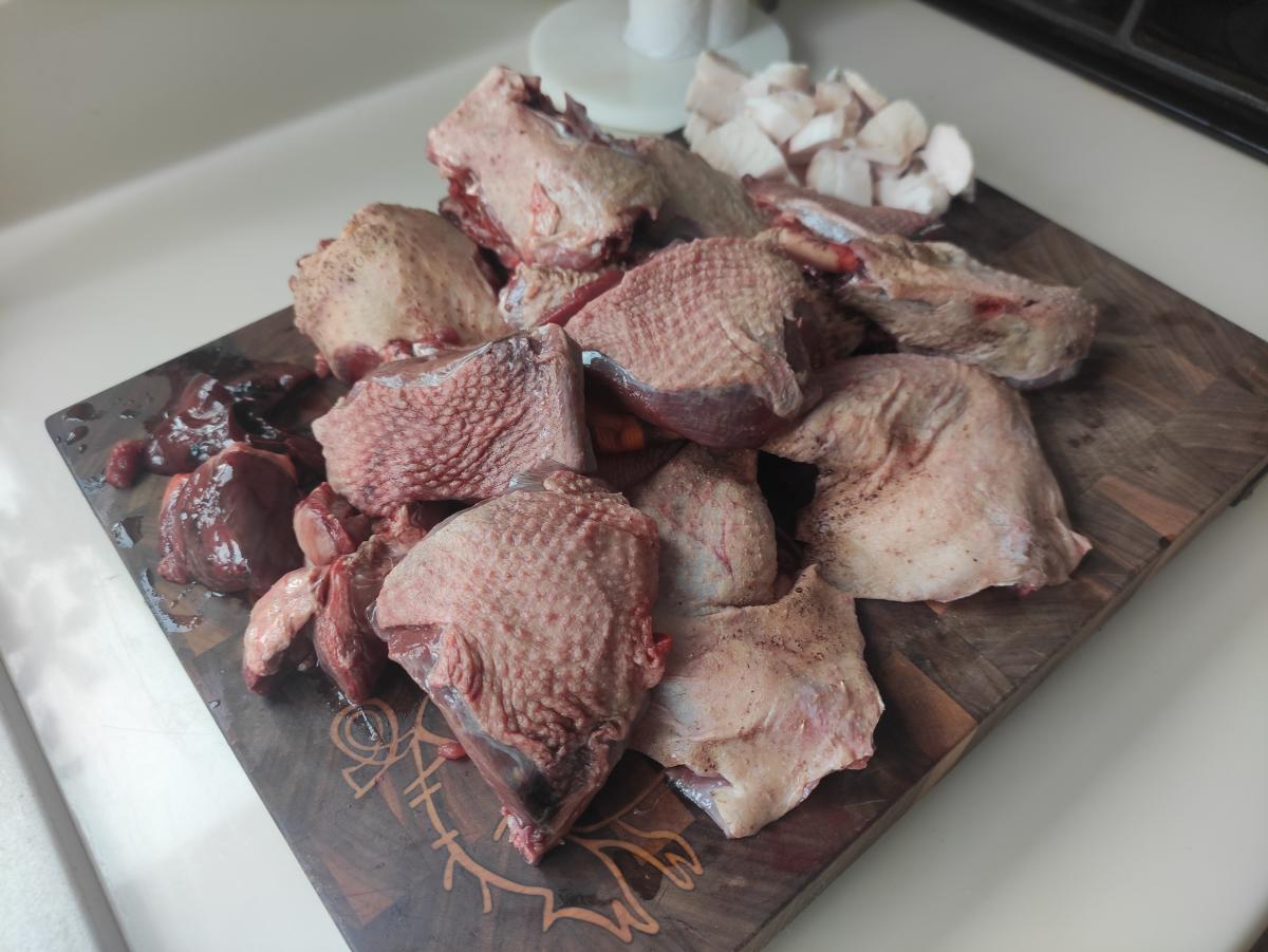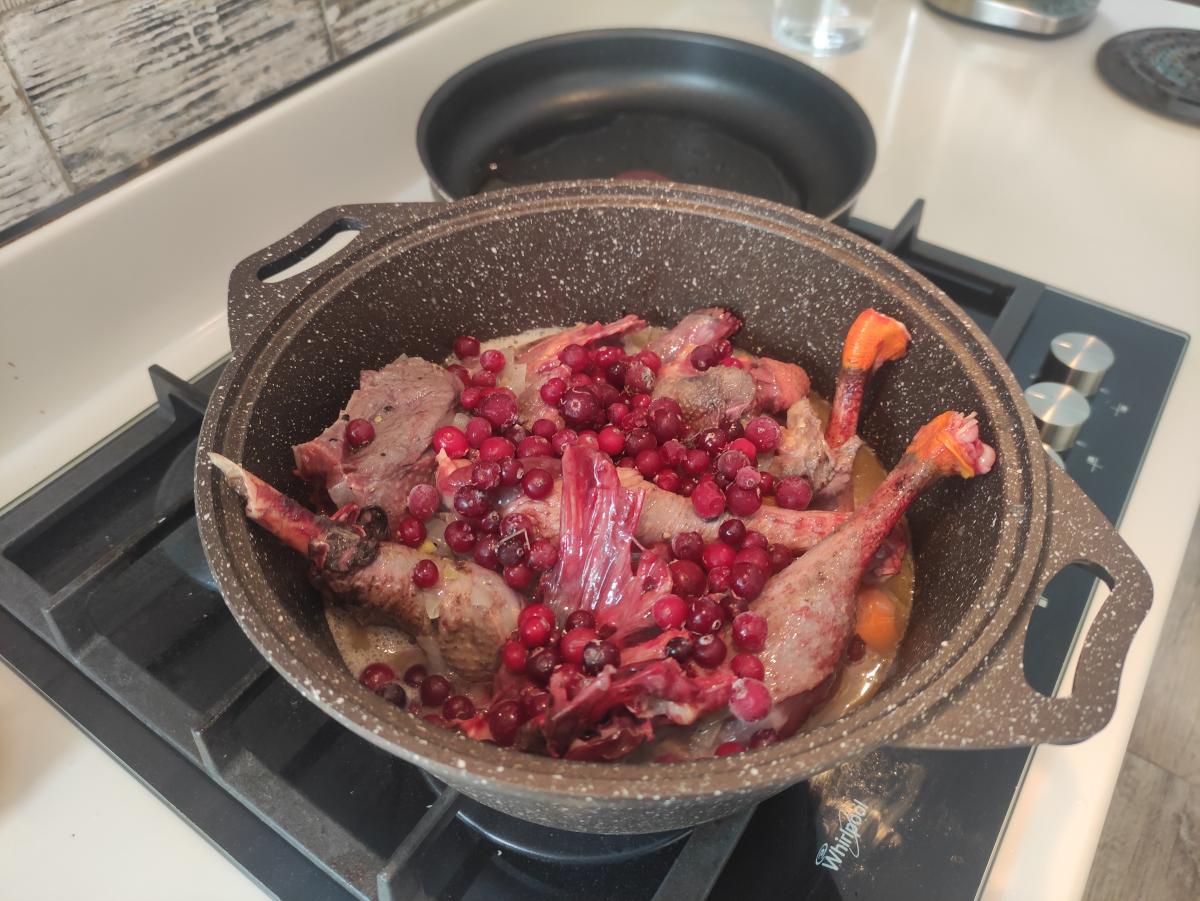 долго ли, коротко ли...пора и запускать в котел ПТИЦУ, вино, ягоды ну и специи какие кто любит, я люблю, но хотел вкус дичи оставить максимально!