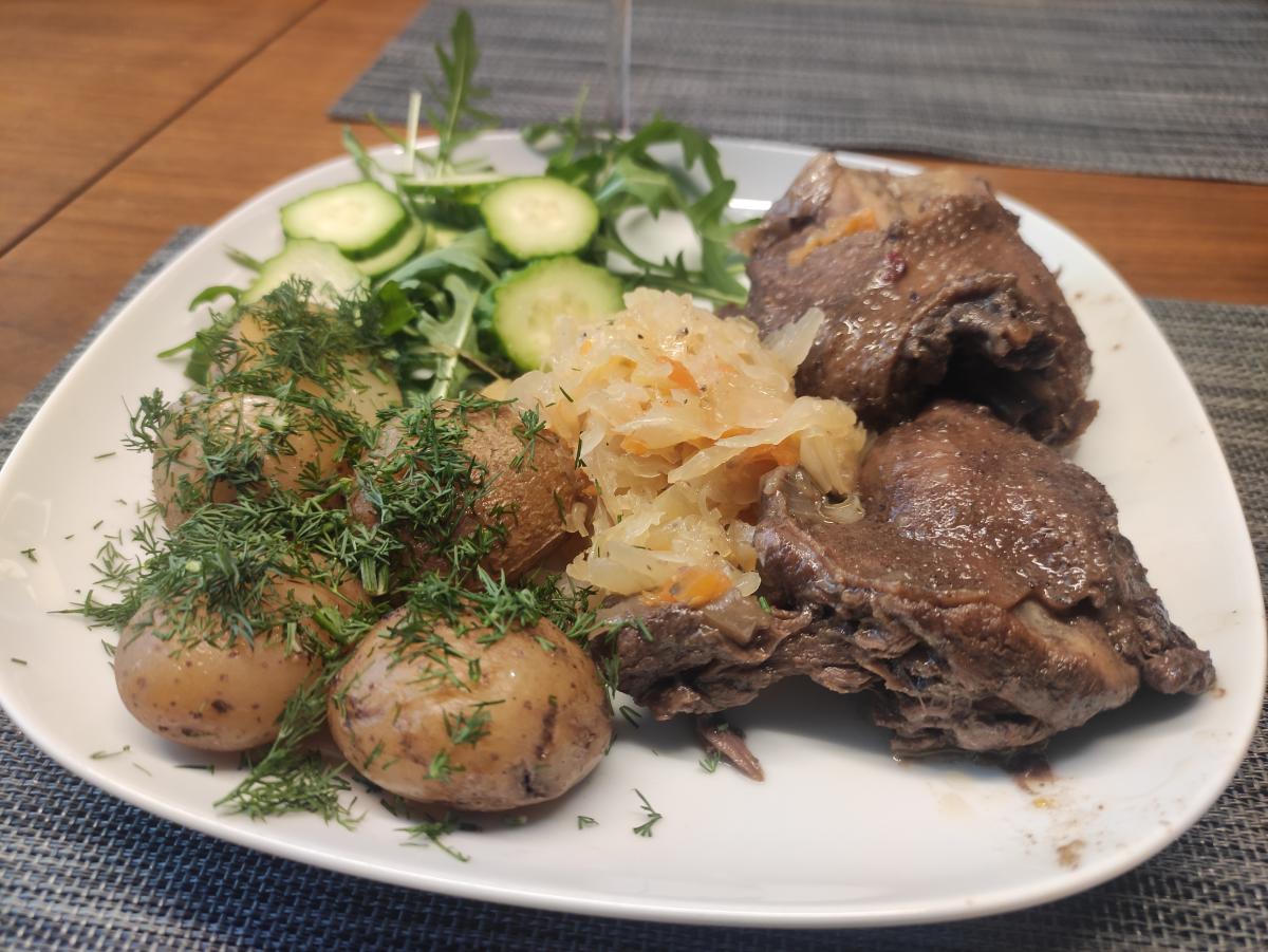За 40 минут прямо сверху цельную мелкую картошечку...., квашеную капустку потушить непременно....сервирую по-красоте:
