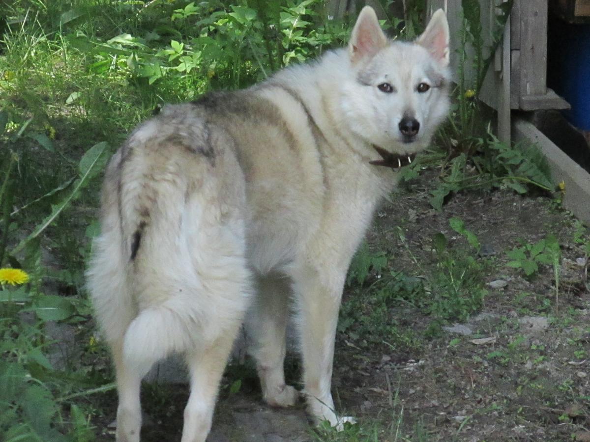 Светло-палевая, голова белая с депигментацией на мочке носа. Фото позже.