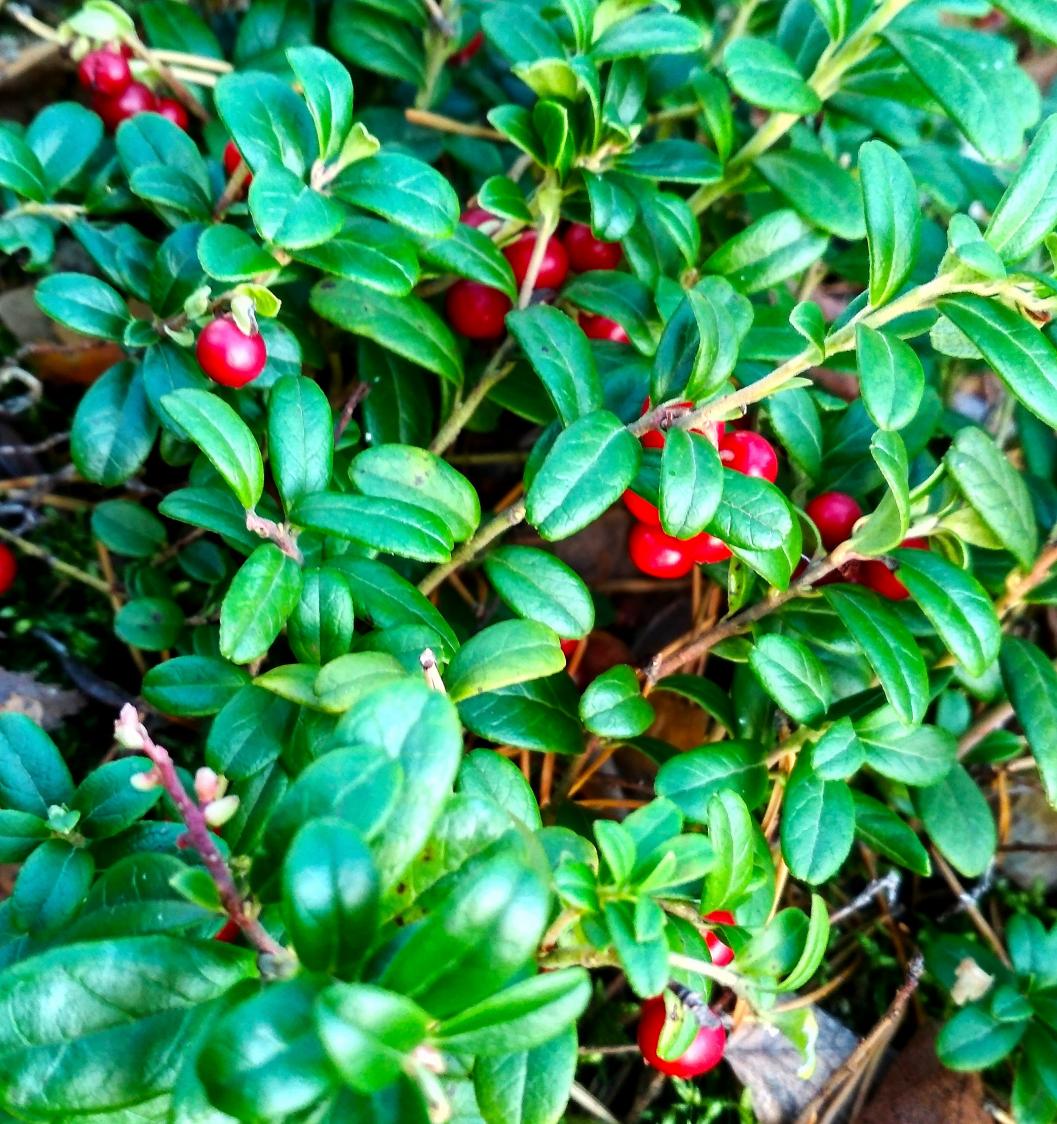 у нас брусника, под снег на кусту уходит. Весной можно с куста есть и брать мороженную.