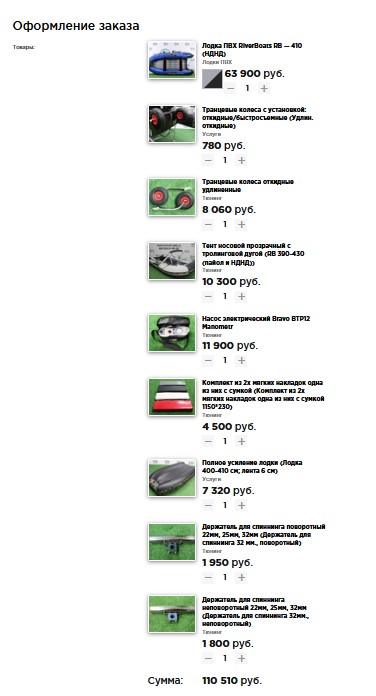 Второе фото - это корзина с сайта по этой лодке. В расчете нет вкладного EVA дна в размер лодки. Без него на сейчас такой комплект стоит ~ 110 т.р.