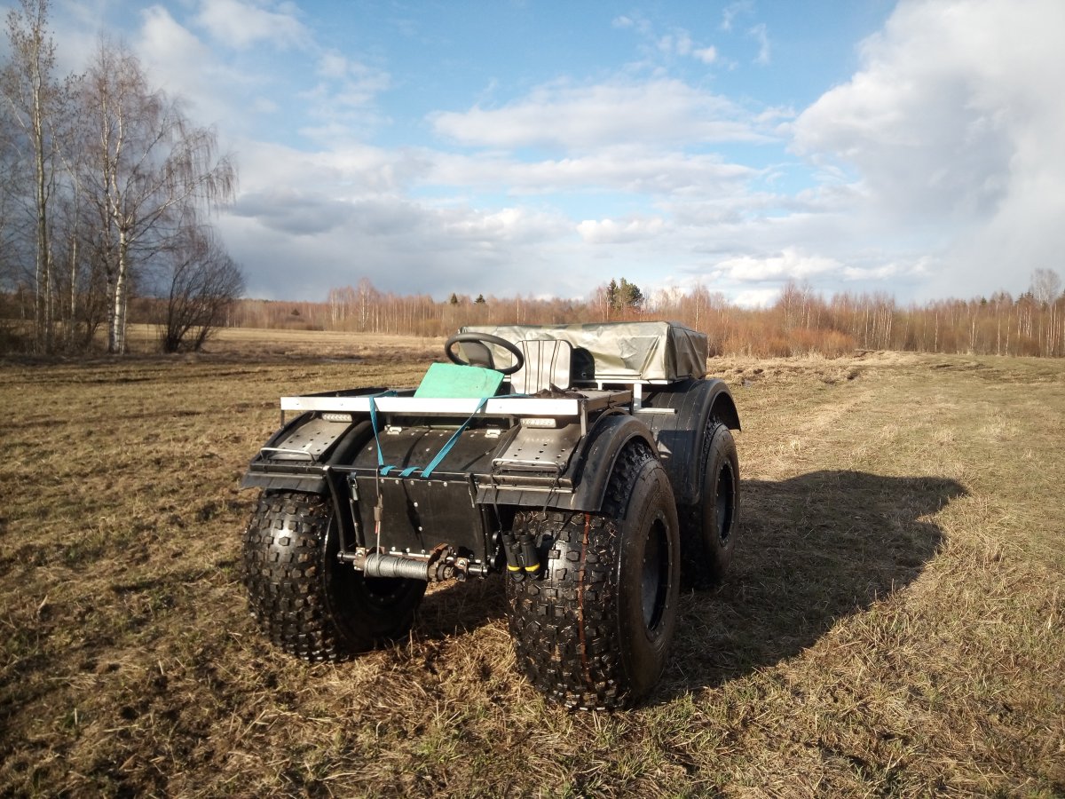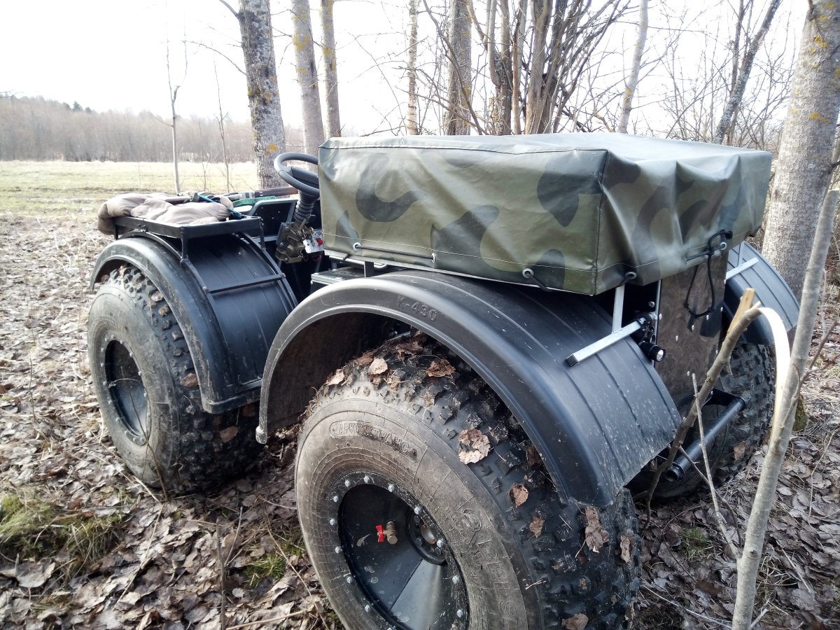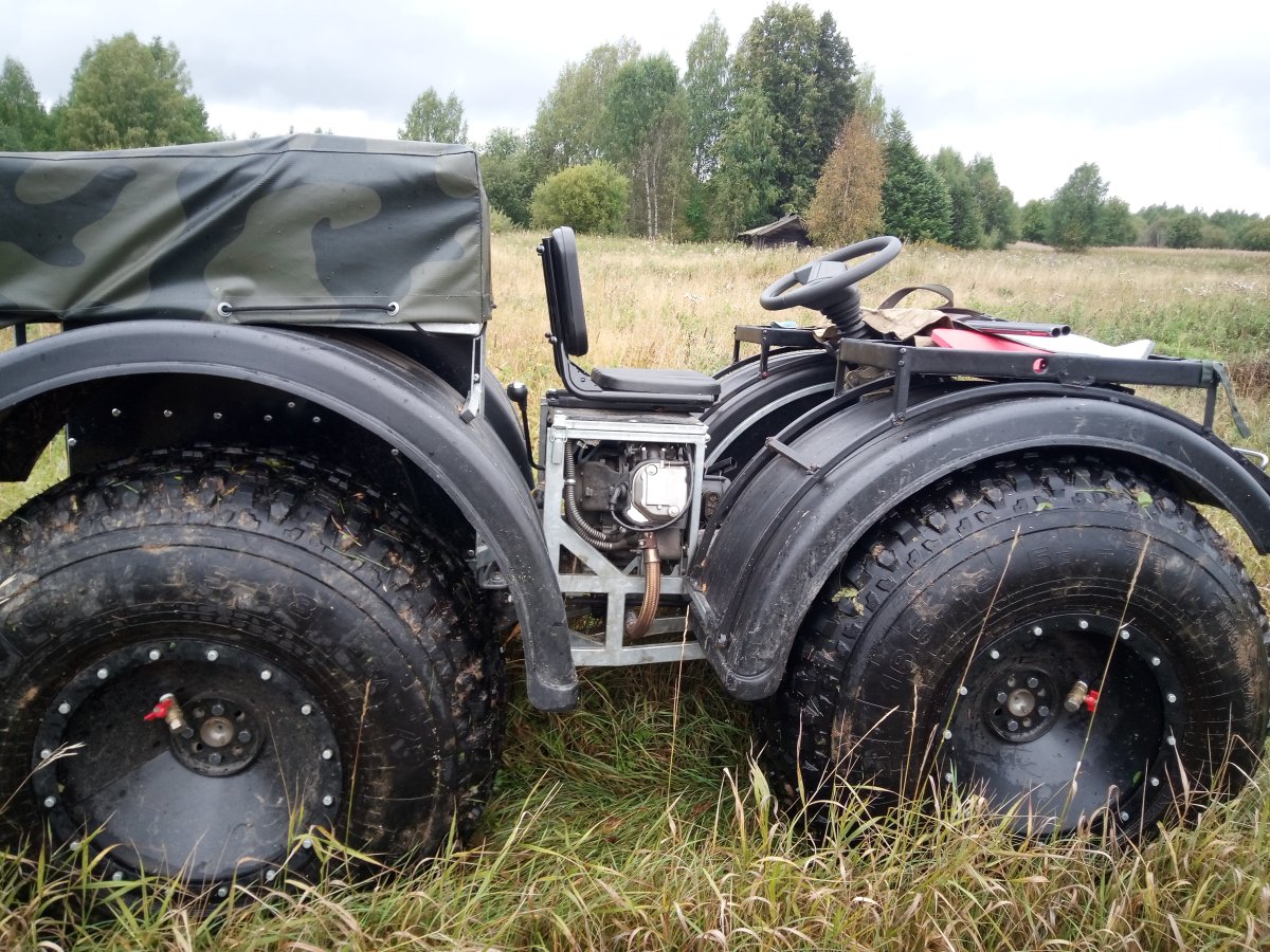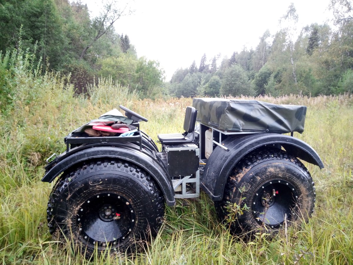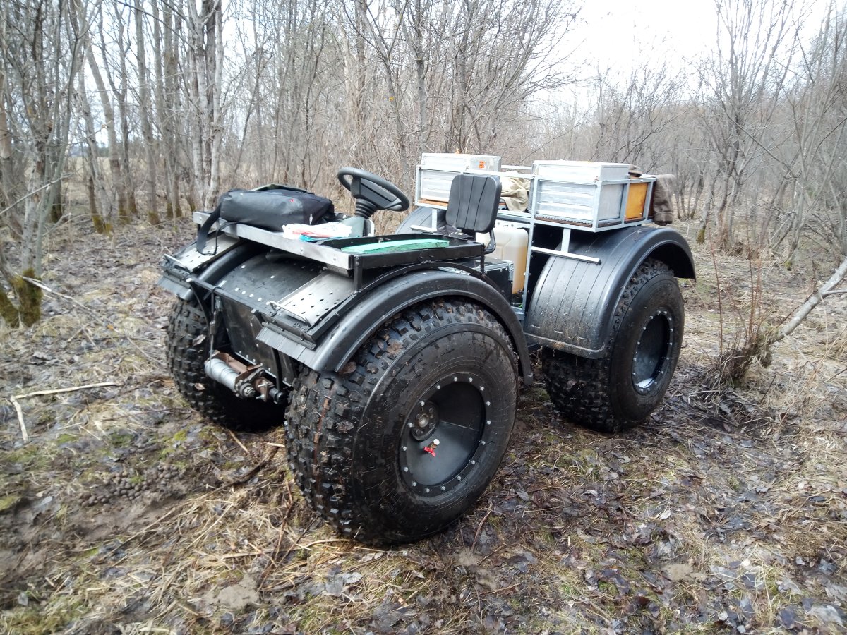 Вездеход переломка.Так получилось,что я в теме.Дом на стыке Вологодской и Архангельской.Переломки делают вокруг,и даже известные-Аврора,например.Нужен был небольшой,на двоих с вещами.Переломки на ободрышах,типа Зис5,отпадали сразу.Только заводская резина,бэдлоки,малый вес.Изготовление не на коленке.Имею опыт езды на колёсных вездеходах,износил четыре краза,два 260.Понимаю сечение вездехода,соотношения размеров,веса,мощности,колёсной формулы,типа трансмиссии.Если коротко-нужен был квадрик.Который ездит везде.Ну,вот он.