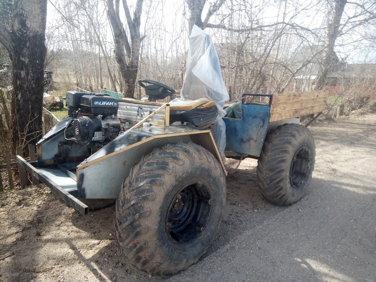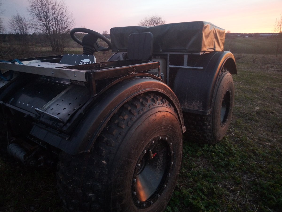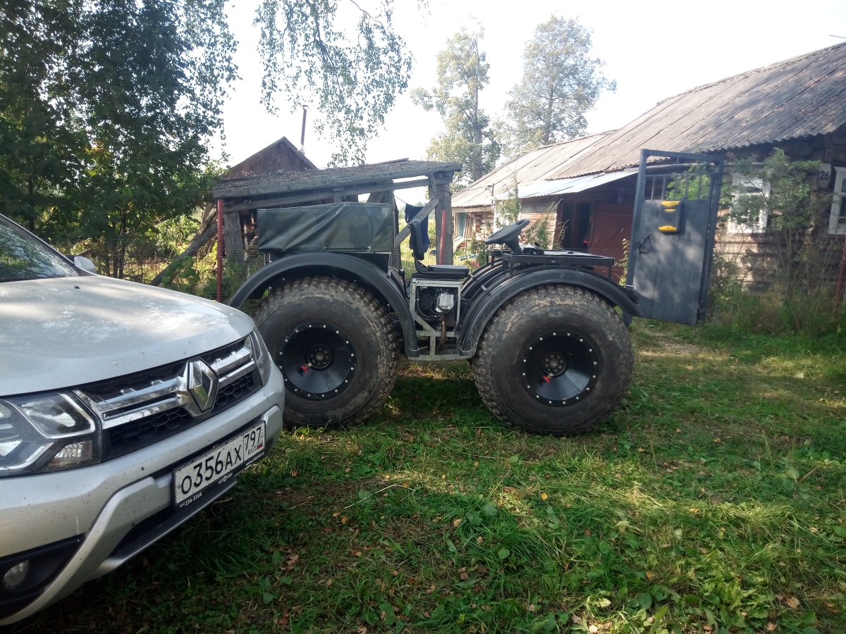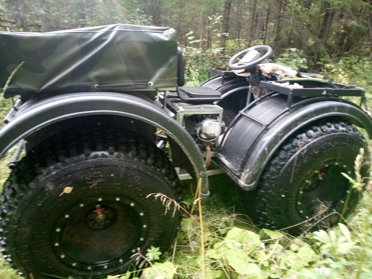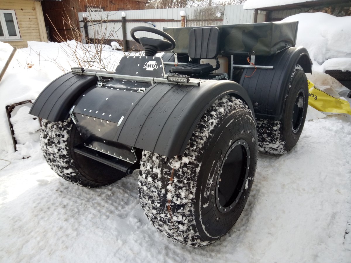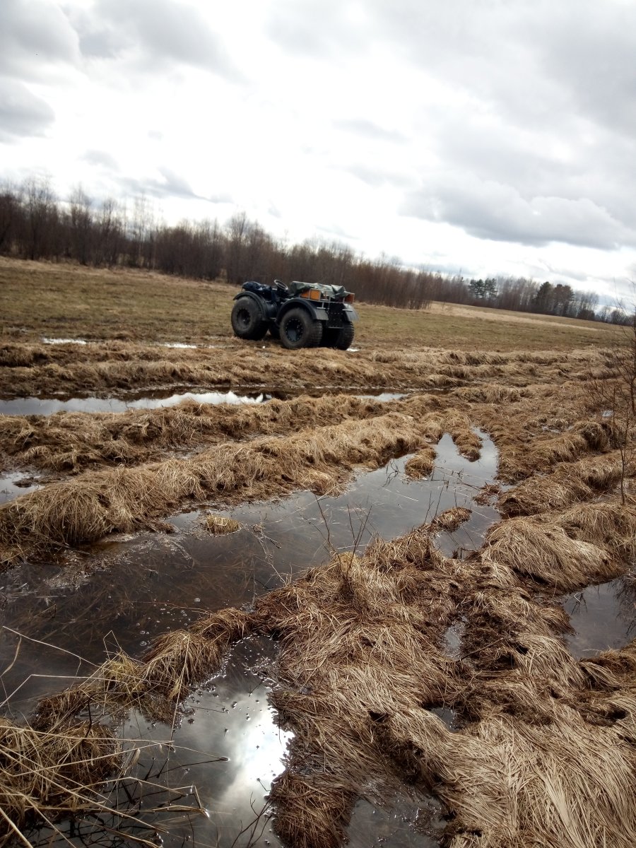 Вездеход переломка.Так получилось,что я в теме.Дом на стыке Вологодской и Архангельской.Переломки делают вокруг,и даже известные-Аврора,например.Нужен был небольшой,на двоих с вещами.Переломки на ободрышах,типа Зис5,отпадали сразу.Только заводская резина,бэдлоки,малый вес.Изготовление не на коленке.Имею опыт езды на колёсных вездеходах,износил четыре краза,два 260.Понимаю сечение вездехода,соотношения размеров,веса,мощности,колёсной формулы,типа трансмиссии.Если коротко-нужен был квадрик.Который ездит везде.Ну,вот он.