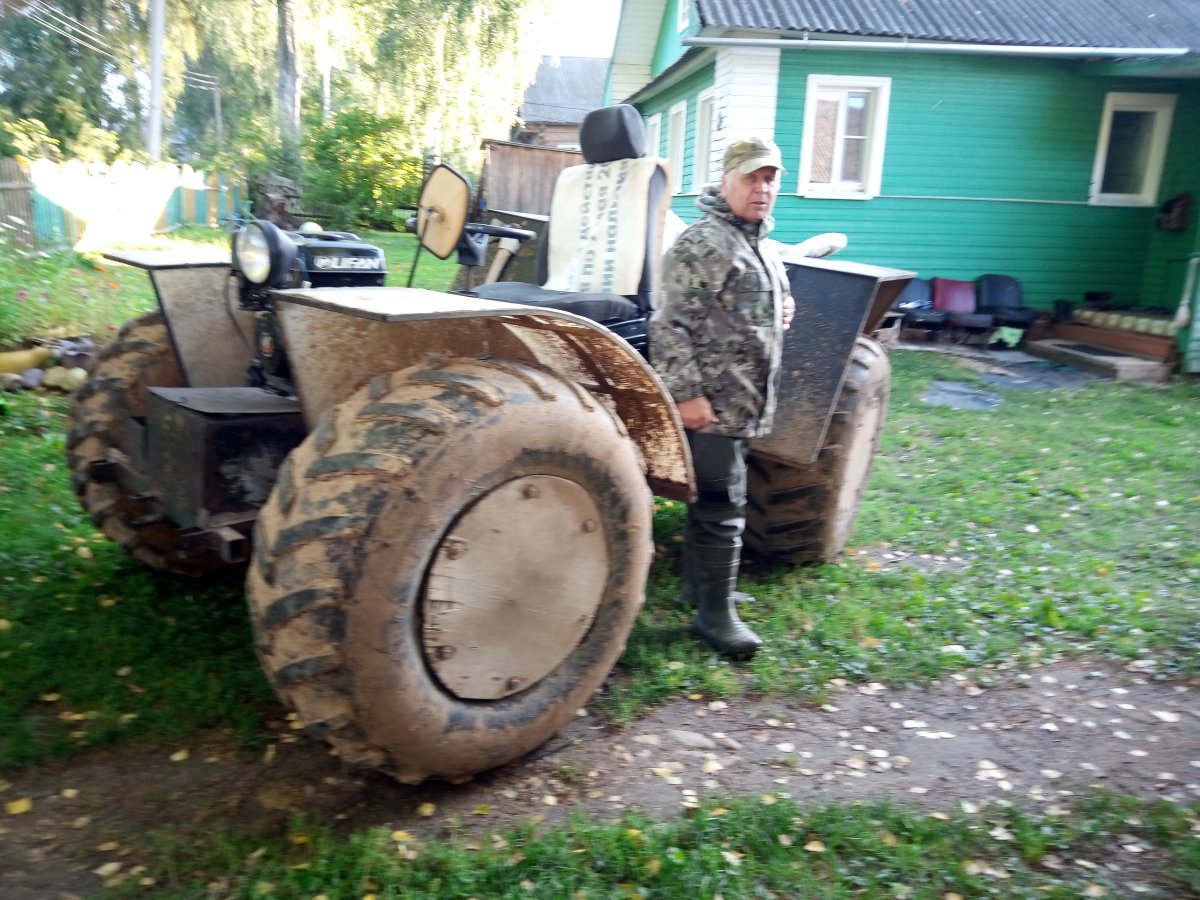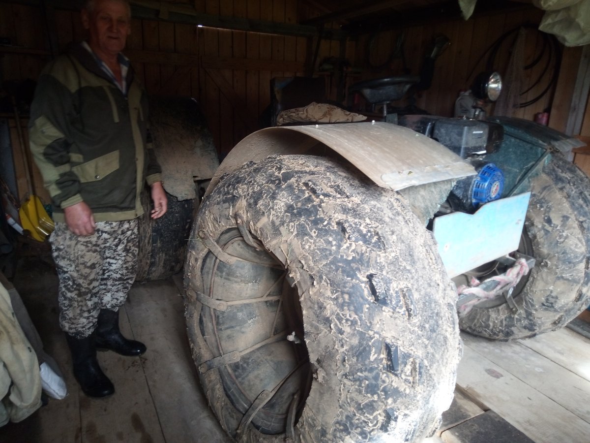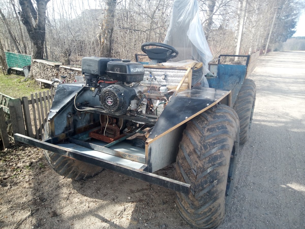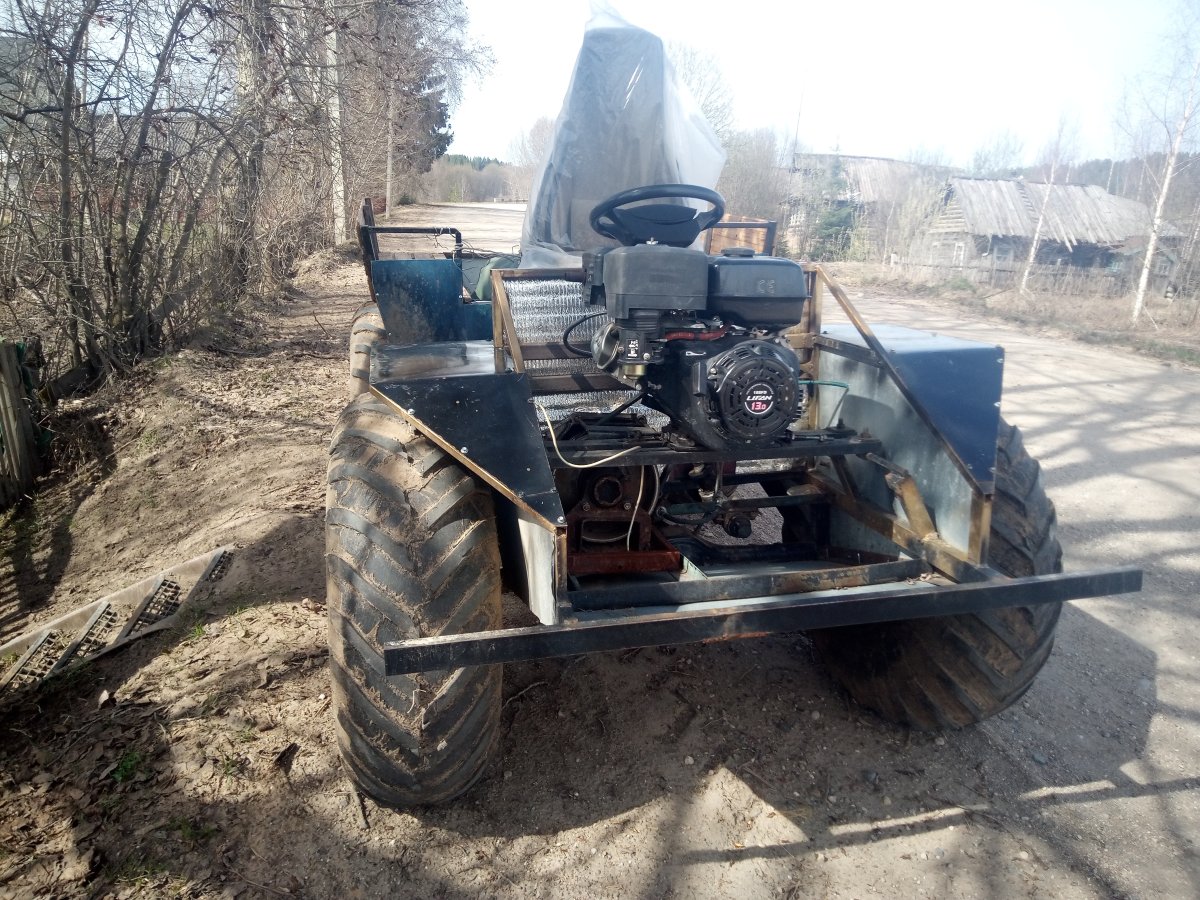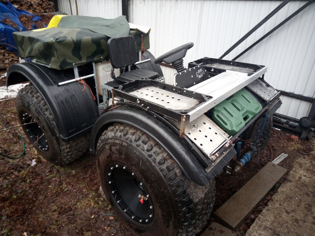 Вездеход переломка.Так получилось,что я в теме.Дом на стыке Вологодской и Архангельской.Переломки делают вокруг,и даже известные-Аврора,например.Нужен был небольшой,на двоих с вещами.Переломки на ободрышах,типа Зис5,отпадали сразу.Только заводская резина,бэдлоки,малый вес.Изготовление не на коленке.Имею опыт езды на колёсных вездеходах,износил четыре краза,два 260.Понимаю сечение вездехода,соотношения размеров,веса,мощности,колёсной формулы,типа трансмиссии.Если коротко-нужен был квадрик.Который ездит везде.Ну,вот он.