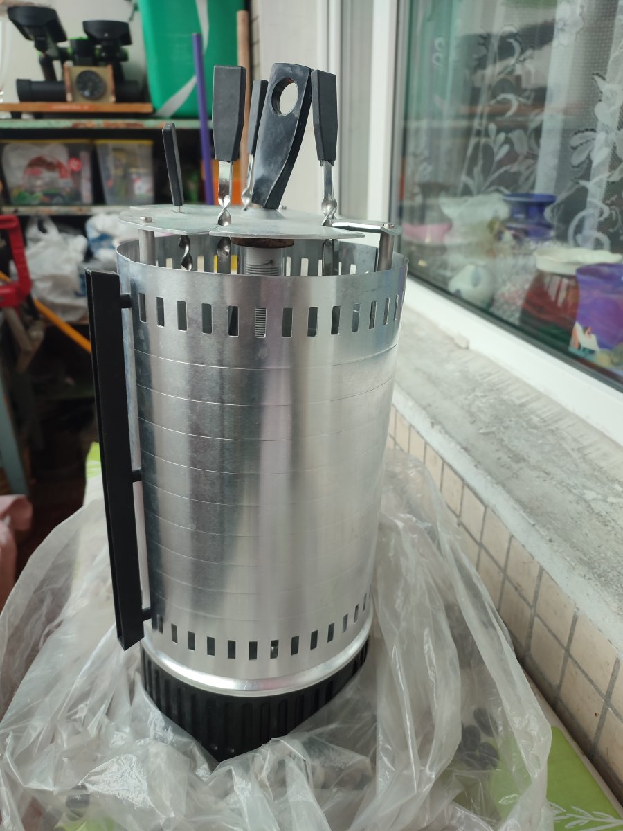 Описание: 5 шампуров. 5 чашек для сбора сока. Защитный алюминиевый кожух. Автоматическое вращение. Нагревательный элемент защищен стеклянной трубкой. Легко моющиеся съемные детали. Шашлык всё таки едят не каждый день, а вот сосиски, колбаски самое то готовить. 1000 руб. Звоните 8921пять семь семь 0953
