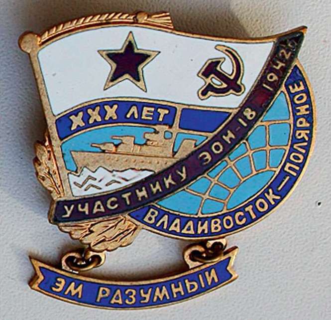 Один из памятных знаков, выпущенных к 30-летию героического перехода из Владивостока в Мурманск. Данный знак посвящен эсминцу «Разумный».