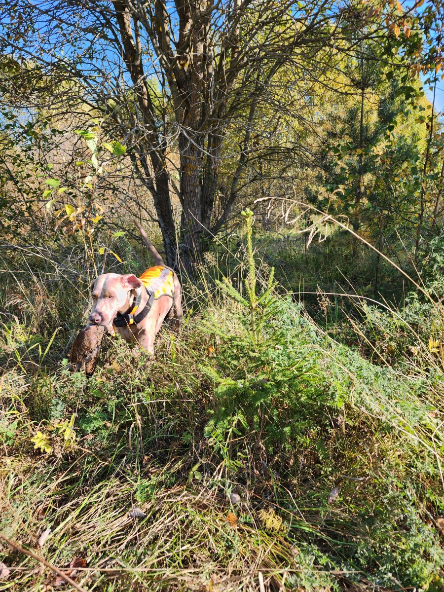 Сегодня утром было попрохладнее, роса, собаке бегать полегче, три работы, одного взяли на конец. Собака умнеет, дальше 70 м не убегала, почти все работы в птицу, но вот ружье плохое- попадает редко!