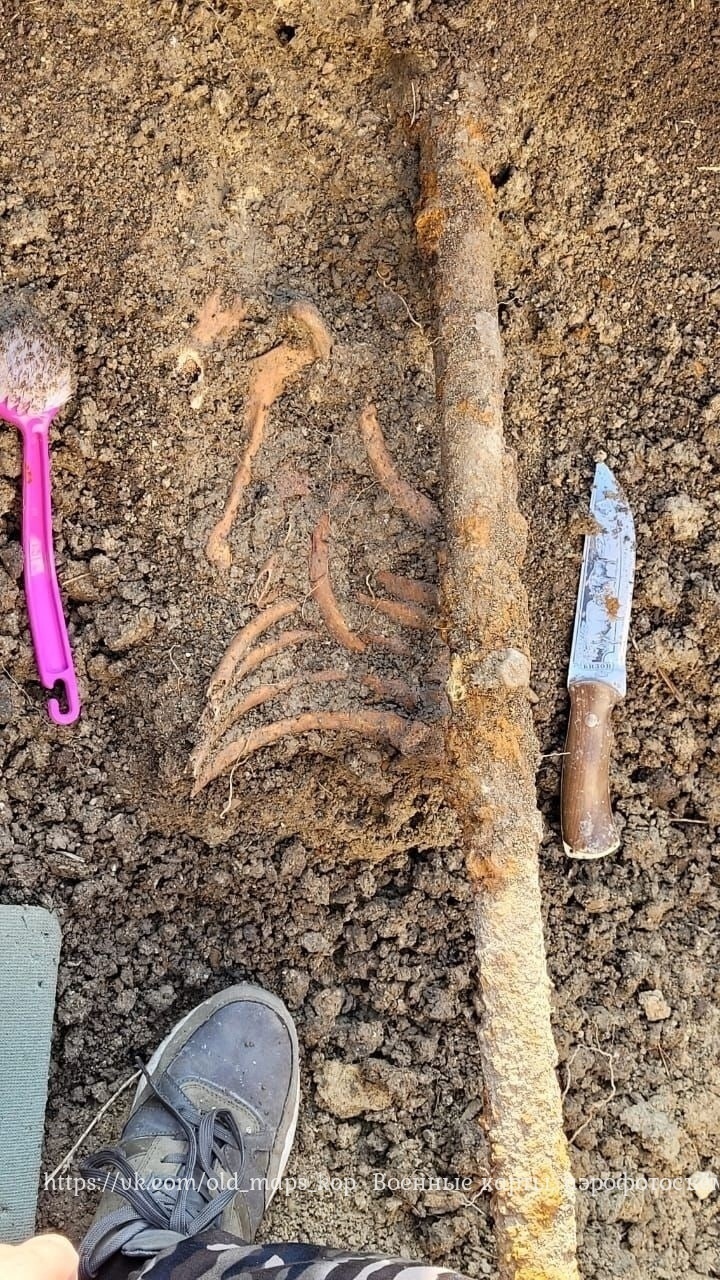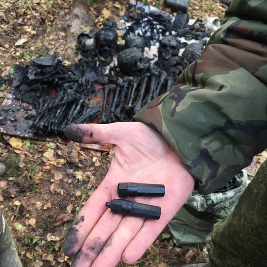 Внутри были останки советского бойца. На голове погибшего - стальной шлем, на ремне гранаты РГД и подсумки с патронами 7.62х54.
