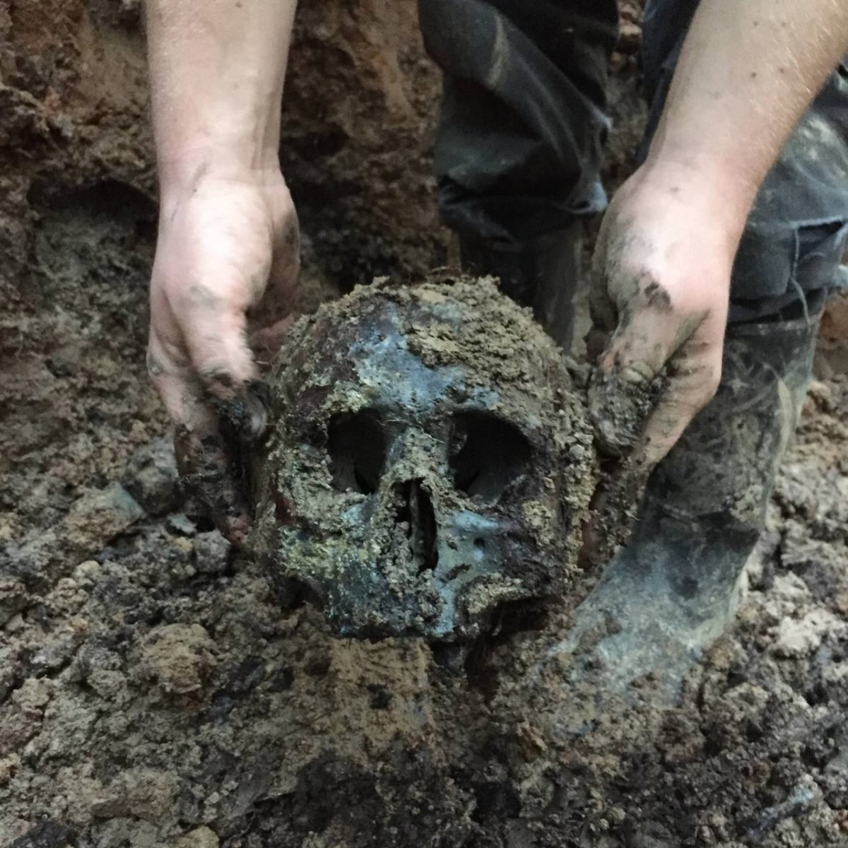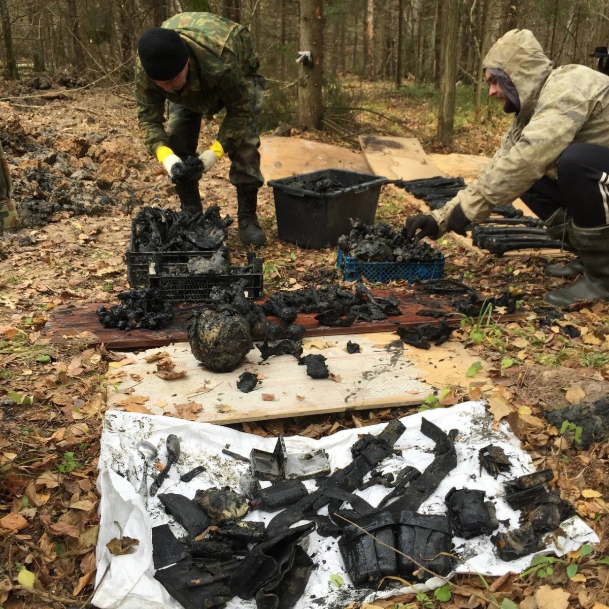 Ноябрь 2015. Район Варшавского шоссе на месте бывшей д. Никольские дворы. Принимал участие в подъеме санитарного захоронения десантников 5-го ВДК, погибших в декабре 1941 во время нашего контрнаступления. Бывшая авиационная воронка в которой похоронили воинов. Кажется было 56 человек. Летом из воронки дачники брали воду для полива огорода, пока в сухой год парни проводившие поиски в том районе не воткнули в нее щуп. Шипение, пузыри и зловоние. Сразу стало ясно, что это «яма». Валенки не гниют. Разложил вокруг раскопа. Жуткая картина…