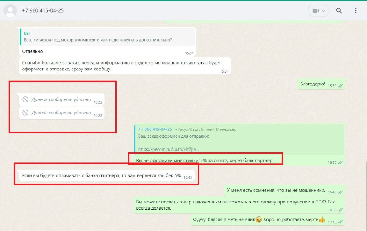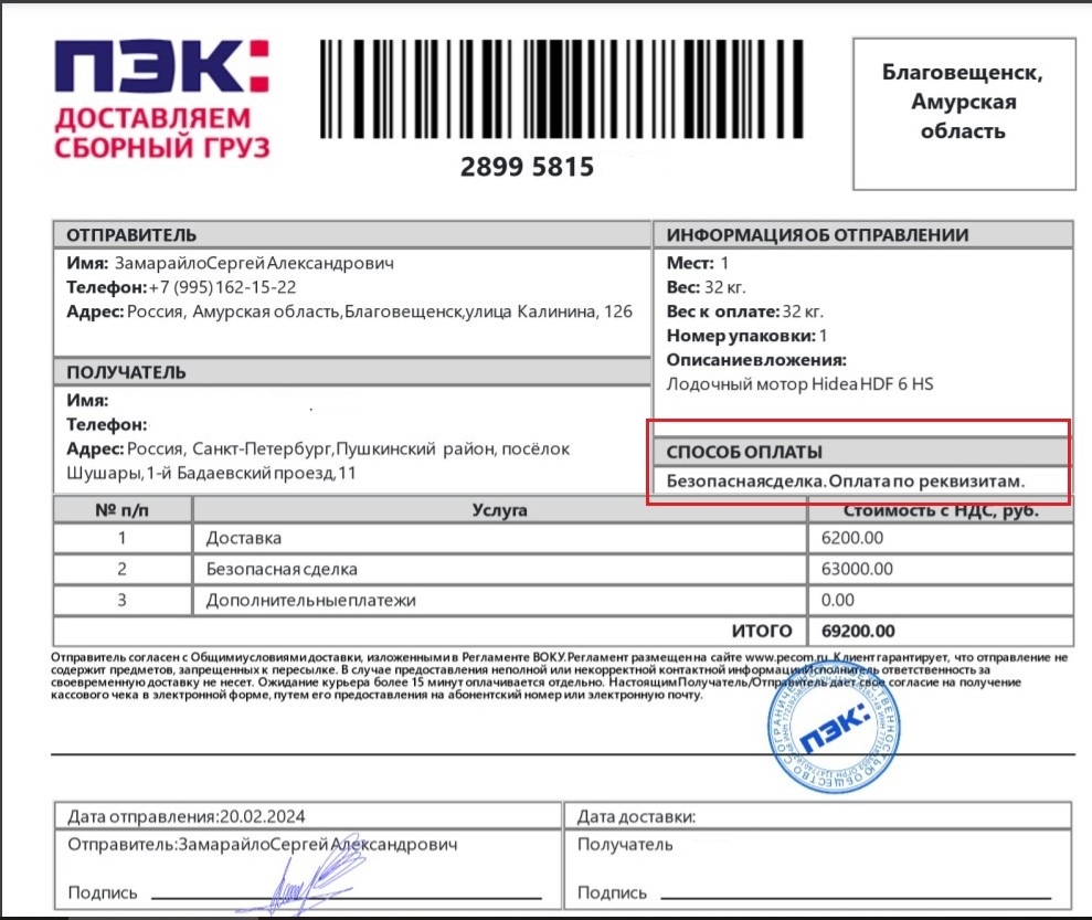 По итогу продавец предложил два варианта оплаты или 100 % и доставка бесплатно или я оплачиваю товар на счет транспортной компании ПЭК+6 200 руб. доставка. И после получения мной мотора, ПЭК переведёт деньги продавцу. Вроде бы все хорошо. Но что-то меня в последнюю секунду остановило.