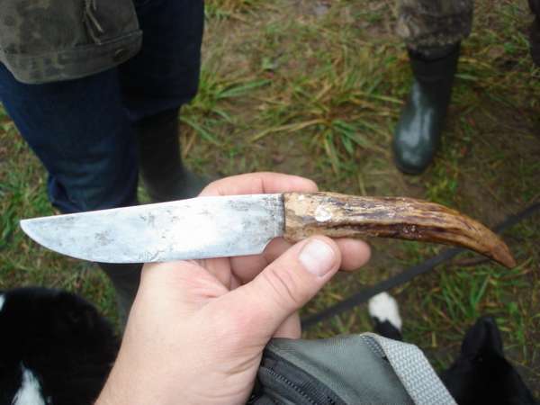 2. Несколько ножей примерно финской формы лезвий, но с более тонкой (более овальной) в сечении рукояткой и несколько подлиннее до 125 мм лезвия, эти рабочие по обдирке и разборке зверушек. Твердость 58-60 по тому же Роквелу.