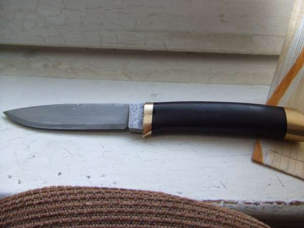 Второй. Клинок - дамаск, рукоять - береста (набор) и дерево. Куплен на выставке "Охота - Рыболовство", изготовитель ЧП в г. Ворсма. Этот нож (точнее форму клинка и рукояти) искал очень долго, года три-четыре, теперь доволен полностью. Удобный.