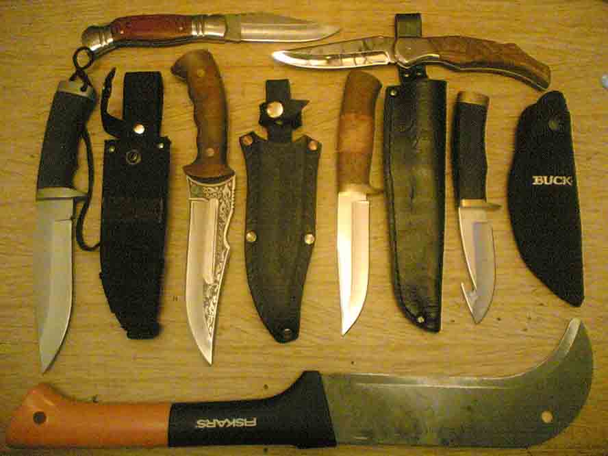 вот и мой арсенальчик. эту фотку уже вроде где то выкладывал с коментарием. В общем из этого всего пользуюсь Южным Клестом(нож с бликом по середине) и складным справа сверху. скинером просто из интереса шкурил зайца,в общем удобно,надо только на серьёзной шкуре испытать