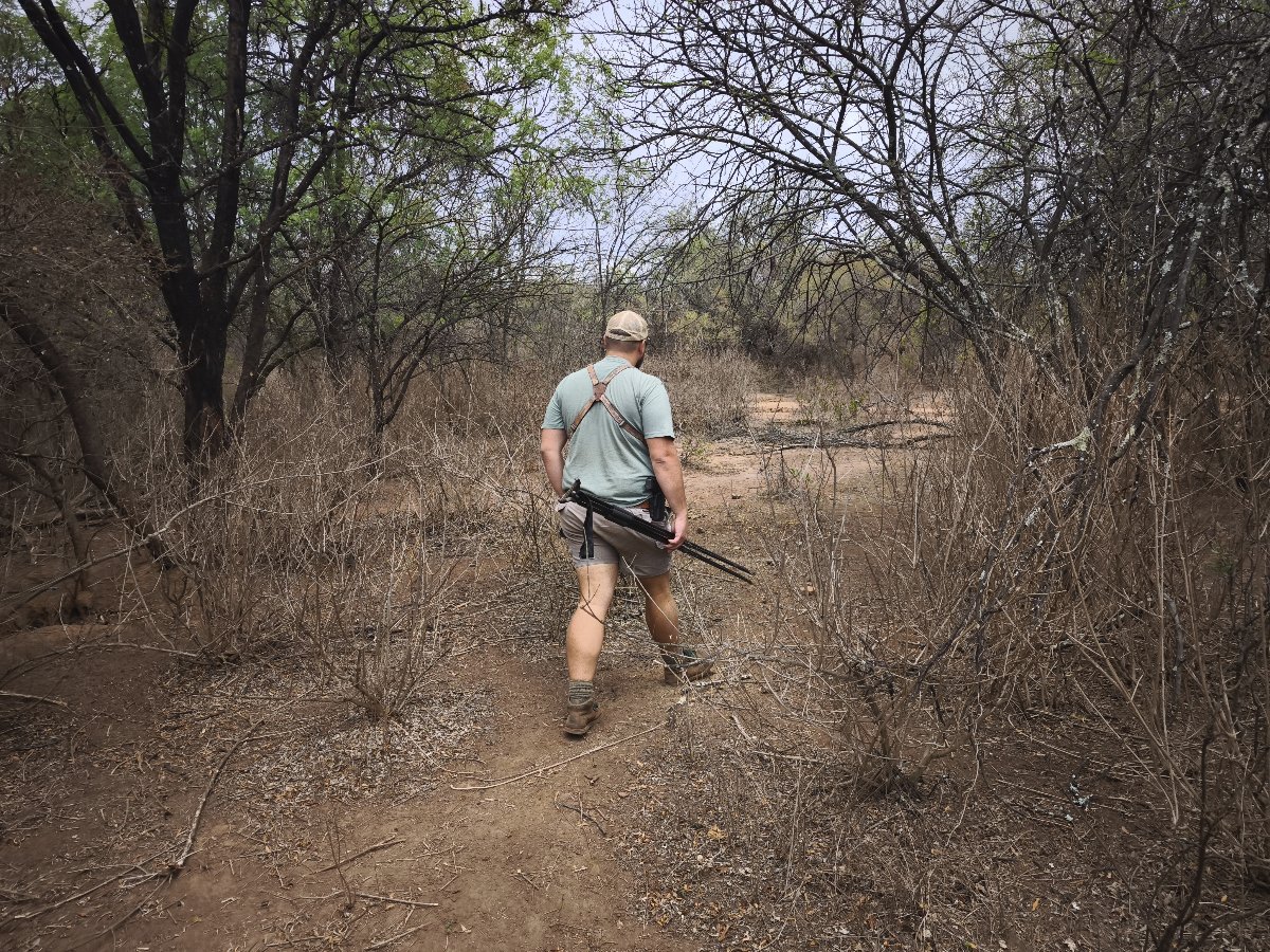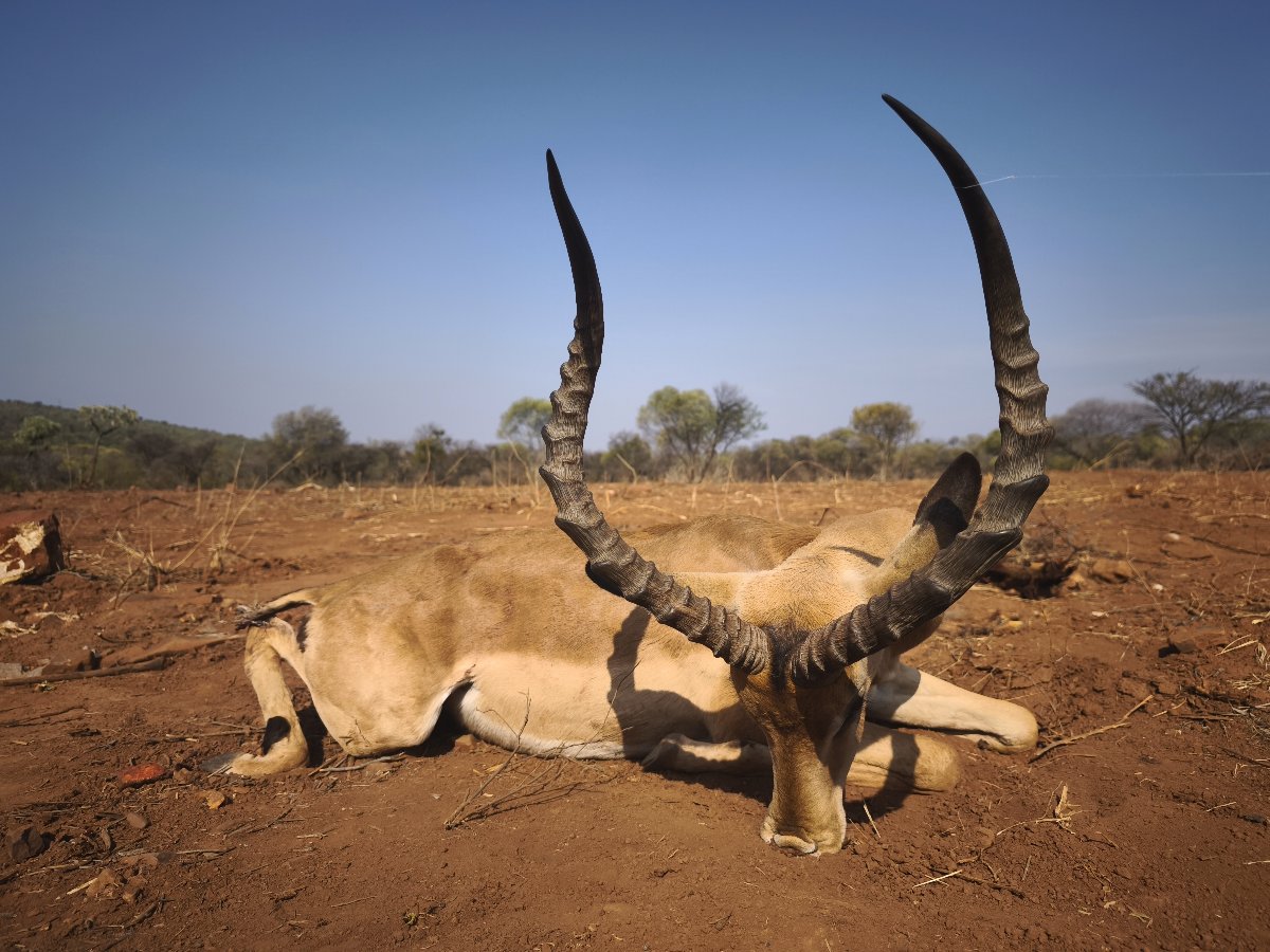 На следующее утро, после английского завтрака и подписания необходимых бумаг, вместе с нашим PH мы первым делом отправились на стрельбище на пристрелку оружия. Там я первый раз стрелял из японской винтовки Howa калибра 308win с оптическим прицелом. Неплохо - сказал PH и еще пощелкал колесиком прицела. Давай контрольный. Потом он показал убойные места предполагаемых объектов охоты и объяснил, что я должен стрелять только по неподвижным ясно видимым целям, и только в том случае если ты уверен что попадешь и не сделаешь подранка. После этого мы отправились в угодья на пикапе Тойота, специально оборудованном для охоты. Наши места были сверху. Светило жаркое африканское солнце, на котором со слов Ника легко сгореть, температура была довольно комфортная - около 25ти градусов, хотя я ждал что будет жарче. На самом деле этот место расположено на плато, которое на 1300 метров выше уровня моря, а Йоханесбург еще выше, 1700 метров, поэтому климат не очень жаркий, хотя и расположен на 25м градусе южной широты. В северном полушарии на этой широте расположен Дубай). Но я отвлекся. Буквально в 100 метрах за воротами лоджа нас встретило стадо золотистых гну, тут же скрывшихся из глаз неспешной рысью. Фотографируем, снимаем видео, ведь они так близко! Поколесив по окрестностям, мы увидели других антилоп, которые так же улепетывали, едва завидев нас, и тут впереди наш PH замечает нужную нам цель - "see it" говорит он. Я смотрю на дорогу - ничего не вижу. Смотри в прицел - знаком показывает он. Смотрю - действительно, впереди, сливаясь с каменистой почвой, стоит пара местных антилоп - импал. Но тут же они поворачиваются и уходят за кусты. Я не успеваю толком прицелиться и решаю не стрелять. Едем дальше - PH опять замечает справа импал и смотрит, выбирая нужную нам цель - старого самца, который не переживет грядущий сезон засухи. Но нет, это или самки или слишком молодой самец с небольшими рогами. Едем дальше. Наконец через какое то время мы останавливаемся, и Лександэр находит подходящего самца импалы и говорит - по английски естественно - смотри - самый левый твой - не перепутай! Я прицеливаюсь, но не так то все просто, его заслоняет другая особь. Wait говорит PH, наблюдая за ним в бинокль. Wait and Shoot when you will be ready. Наконец тот поворачивается боком. Расстояние - метров 100-150. Я прицеливаюсь чуть выше передних ног - в лопатку, задерживаю дыхание и нажимаю на курок. Бах - и антилопы срываются с места. Мы подъезжаем к месту где они стояли. На красноватой земле алеет кровь - значит попал все таки. Вместе с PH мы идем по следу через кусты в бушвелд. Кровяной след уводит дальше в густой кустарник, мелятник по нашему. Наши спутники отстают. Вроде бы я слышу какое то движение. Рукой показываю Лександру - она там. Идем дальше. Затем след метров через 150 пересекает лесную дорогу и еще через 50 метров около русла засохшего ручья теряется. Там земля устлана прошлогодними сухими листьями. Видно что антилопа временами ложилась, теряя много крови, но даже обрезая по довольно большому радиусу окрестности нам не найти, куда она ушла. Значит она дойдет, выстрел смертельный, но вопрос когда? Между тем время близится к полудню и наш PH решает прервать поиски, чтобы продолжить их после обеда. Возвращаемся в лодж. У них нет собак, работающих по кровяному следу, хоть там и были бигль и такса, но они уже старые. Это сильно облегчило бы