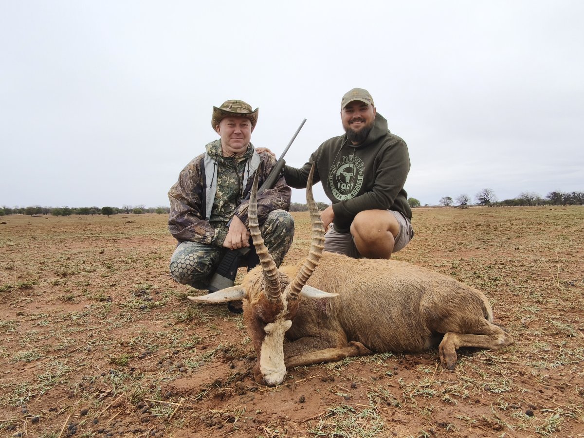 На третий день утром с неба все еще хорошо поливало и я даже подумал, что нам придется пережидать непогоду сидя в лодже, но Ник сказал, что охота состоится в любом случае. Ок, ноу проблем. Благо в лодже везде есть вай-фай и Яндекс говорил что через пару часов дождь должен прекратиться. Кстати наш PH Лександэр был всегда вооружен пистолетом, поэтому это внушало чувство безопасности, хоть Ник и утвердал, что опасных хищников в угодьях нет. А вдруг стадо бабуинов решит проверить наши сумки? В телеграмме писали, что в некоторых местах и такое бывало. Мы грузимся в машину, наш PH берет с собой наш обед, и мы едем в другие угодья примерно за 150 км к юго-западу. Местность за окном постепенно становится другой: огороженные каменистые поля, почти саванна, местами огражденная высокими заборами под электричеством. Необычные мачты линий электропередач. Проезжаем небольшие городишки, где магазины забраны решетками, с сидящими перед ними аборигенами. Местами вполне приличные дома, но за заборами под колючей проволокой. Кое-где стоят ветряки, качающие воду. Говорят, некоторым больше 100 лет. Экзотика. И наконец мы приезжаем на место. Это больше степная местность, поросшая редкими деревьями, вся каменистая или песчаная. Там где песок, она усыпана норами, вырытыми бородавочниками или какими то другими животными, которые прячутся там от летней жары. Вроде бы здесь должны обитать жирафы и носороги, но местный егерь говорит что буквально на этой неделе 5 носорогов убили охотники за рогами, поэтому остальных они увезли в другое место. А жирафы видимо из-за дождя не хотели попадаться нам на глаза. Но мы здесь не за этим. Вдалеке видны стада антилоп. Гну, спрингбоки и какие то другие. На открытой местности они не спешат подпускать нас на расстояние выстрела. Довольно долго мы колесим по расбухщим от дождя полям. Наконец PH увидел достойного самца спрингбока. Раньше спрингбок был даже на гербе ЮАР. Однако тот как назло все время уходил от нас показывая нам свой зад. И несколько раз мы переезжали, пытаясь подобраться ближе, но нет, прыг скок и вот он уже мчится вместе со своим стадом за пару км от нас, а мы едем на перерез, буксуя в красной глине. Ладно, убежал, поищем другого. А дождь то усиливается, то прекращается. И сама погода и температура +18, напоминает такую же питерскую... поэтому сверху сидеть не особо комфортно... приехали называется в знойную Африку )) Найдя другое стадо, пытаемся подъехать к нему поближе. И вот PH говорит - вот справа твоя цель. Нет теперь он слева, а вот опять справа. Жди. Замер. Пытаюсь прицелится... капли дождя мешают... Выстрел. Попал чуть правее чем нужно. Тот пытается встать. Быстро подъезжаем и PH добивает из своего пистолета спрингбока, чтобы тот не мучился. Фото-отчет для истории, грузим антилопу в кузов, сами перебираемся в кабину и мы едем дальше по полям, объезжая норы-ловушки. Пару раз спугивали местных степных зайцев. С виду они не больше котенка. Мы ищем последнюю цель нашего сафари - достойного самца антилопы блесбока. Но так же довольно долго тот не давал подобраться близко. И вот увидели. Преследуем. Тот замер. Довольно далеко. А вдруг опять уйдет? Я прицеливаюсь из окна кабины. Ловлю его в перекрестье чуть выше чем обычно. Нажимаю на спуск. Тот сразу лег. Как сказал PH: perfect shot с расстояния 340 метров. Все как всегда, фотоотчет, глоток виски за удачу,