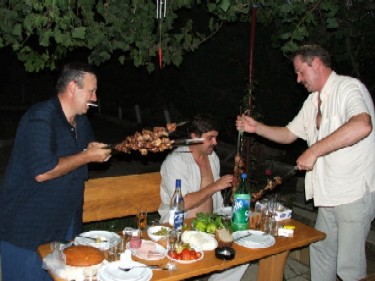 После обеда, заехав в магазины, мы двинулись на Апшеронский полуостров, в домик у моря. Быстро стемнело и на пляж, который находился в 200 метрах от дачи мы уже не пошли. Нас ждала восточная сказка в виде экзотического кавказского ужина в беседке под виноградной лозой. Гроздья винограда можно было достать рукой, просто привстав со скамейки. Не буду описывать здесь все, что росло в саду, но эвкалипт и спелые гранаты вызывали ощущение сна. О кулинарном мастерстве хозяина расскажу в другом месте, но шашлык из барашка (ох уж эти барашки!) на углях из тутового дерева в исполнении Адиля был изюминкой вечернего стола.