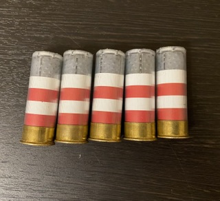 Пять фальшпатронов калибра 12/70 с полиуретановым имитатором капсюля. Сделан из новой прозрачной гильзы АЗОТ, содержит 28 грамм дроби, закрыт звездой.