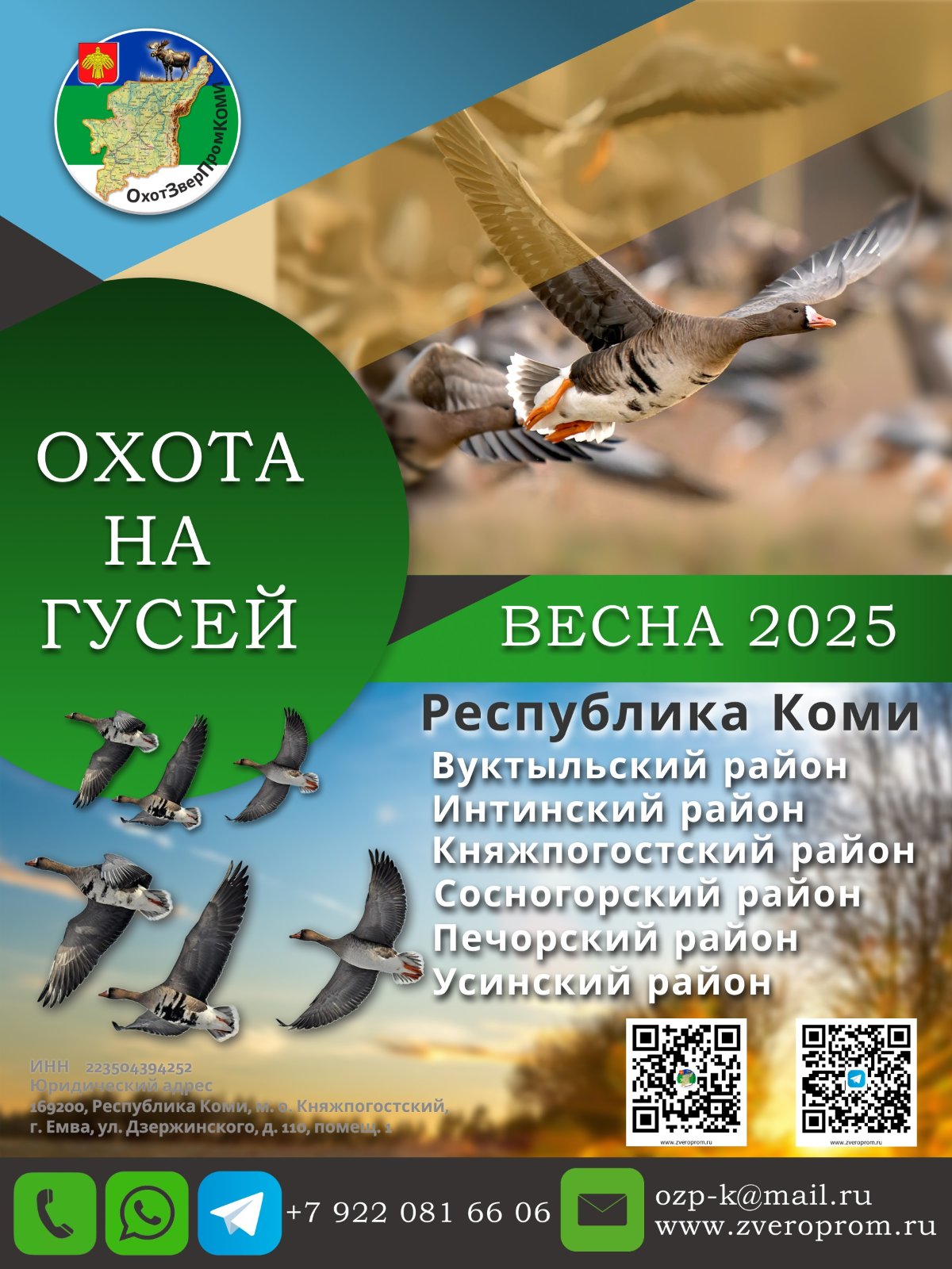 Главный охотпользователь республики Коми "ОхотЗверПром", 2.880 млн.Га, 6 районов. Приглашает на весеннюю охоту на гуся. (он не пролетный, гнездится у нас).
