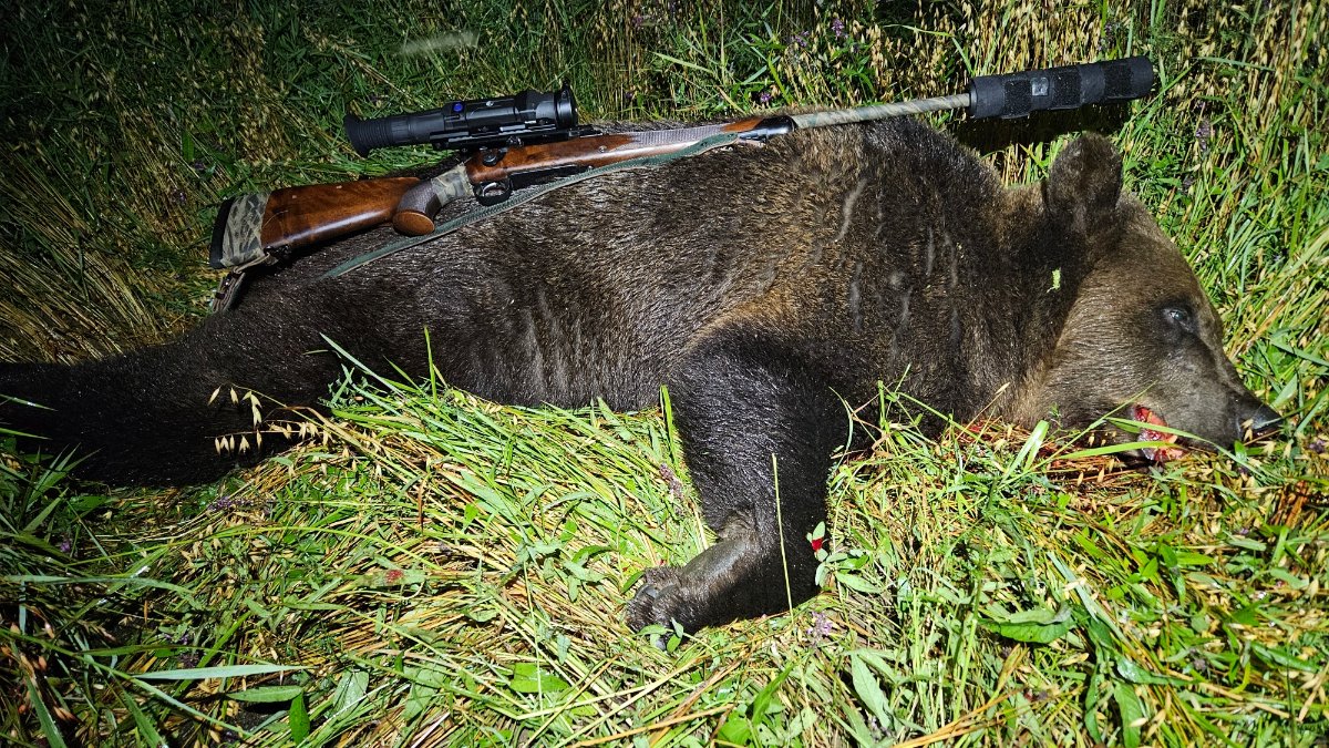 Медведь уже был в центре поля, похоже момент его осторожного выхода и выяснения ситуации вокруг, я пропустил. Осторожно беру в руки карабин, ставлю его на подоконник и нечаянно задеваю длинным стволом за край окна. Слабый удар по дереву, но четкий, все наверное уже слинял, подумал я... Включаю прицел и вижу спокойно кормящегося медведя, уф повезло, все в порядке. Прицеливаюсь и стреляю.