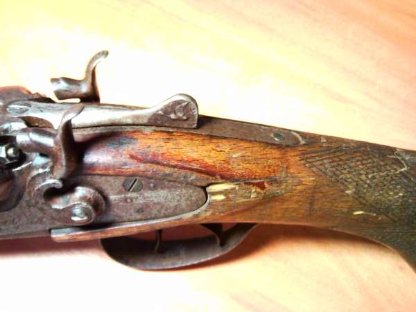 Привел домой и внимательно осмотрел. Да… потрепала его жизнь сильно. Не мылся, старый, лет 10 последних, ржа повсюду: и снаружи, и внутри. Ложа треснута, цевье во вмятинах. Руки бы оторвать прежним родным. Продольного шата нет, но есть боковой. Руками ощущается, но щели не видно. Стволы ровные, не дутые. Курки и бойки рабочие.