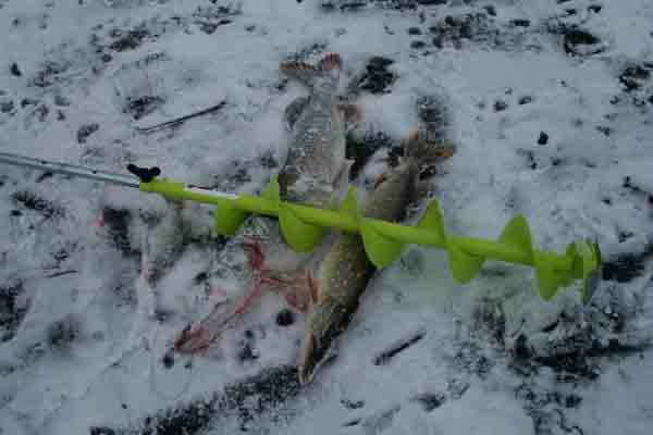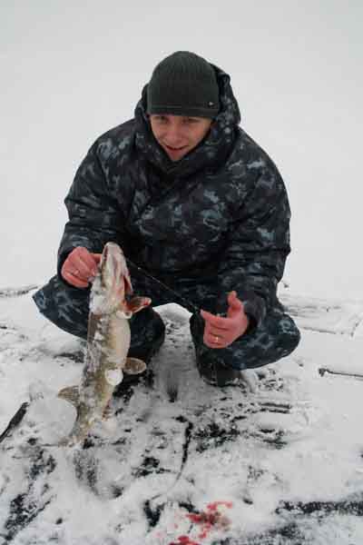 Наловили живцов и пошли на предположительно клевые места.Сразу закормил четыре лунки для жены. Сам собирал и ставил жерлицы.Живец-окунь.