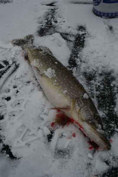 Вскоре рядом загорелся флажок и довольно резво закрутилась катушка...пауза...еще подождал ...закрутилась...все тащу...Очень тяжело идет..подвожу,ба, она большая...рот открыла и пасть в лунку не лезит(лунка-130мм)...все таки вытащил кричу жене с фотоаппаратом..