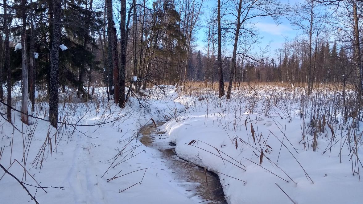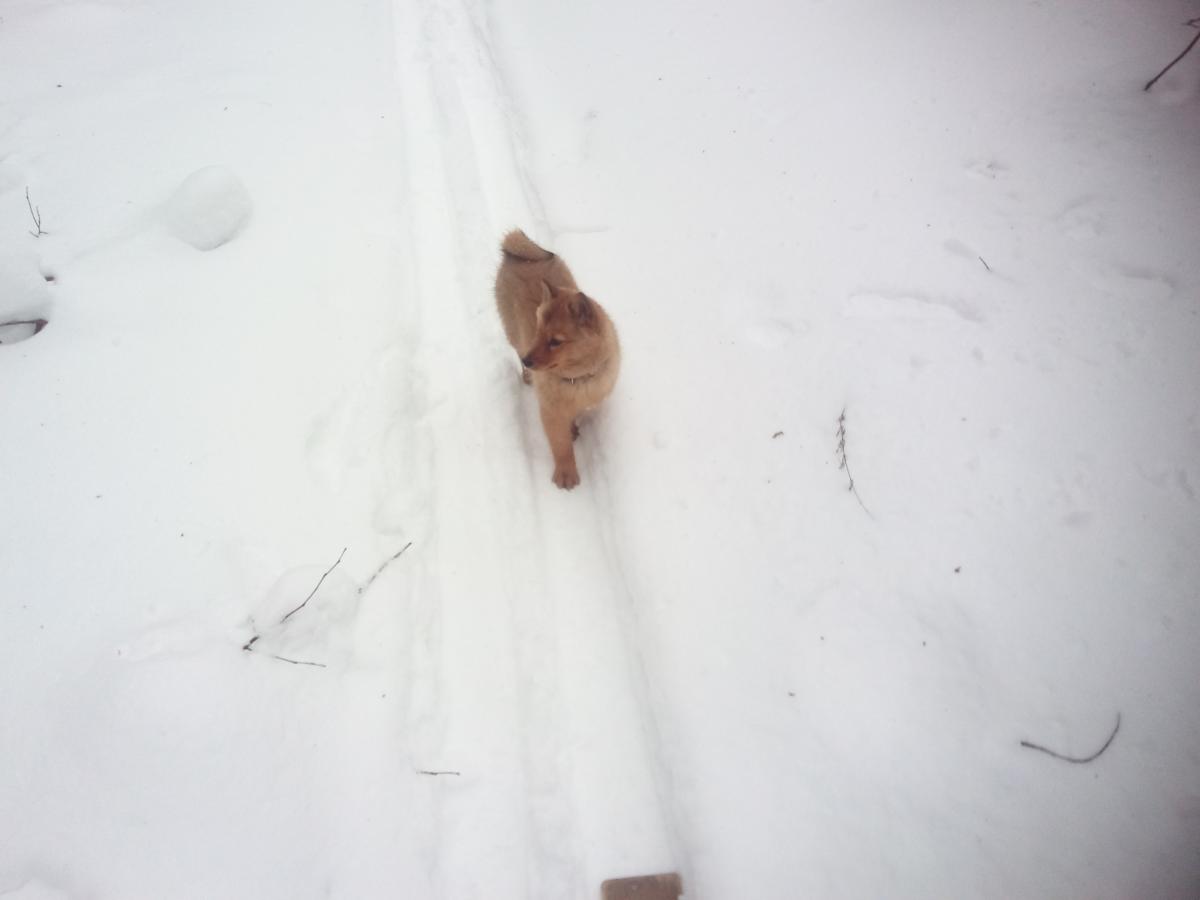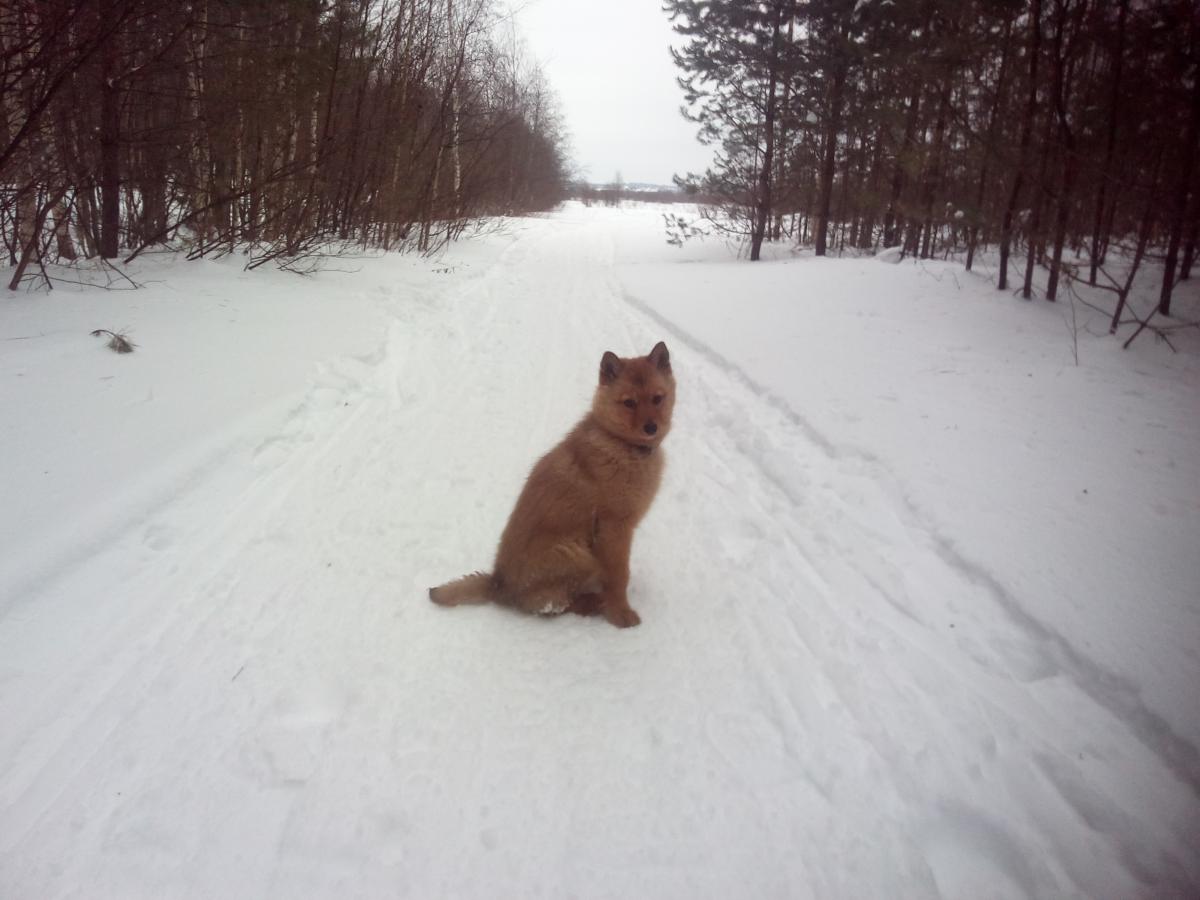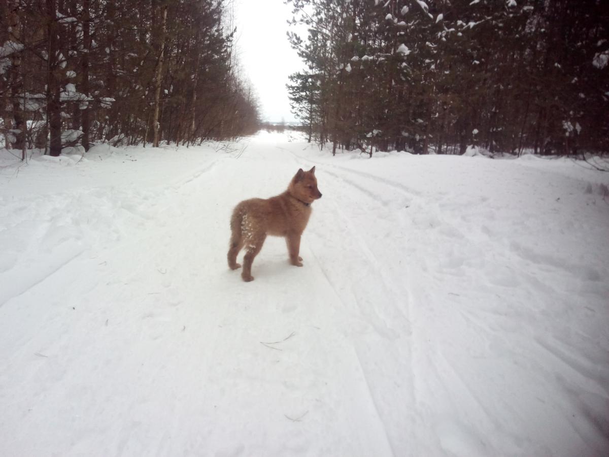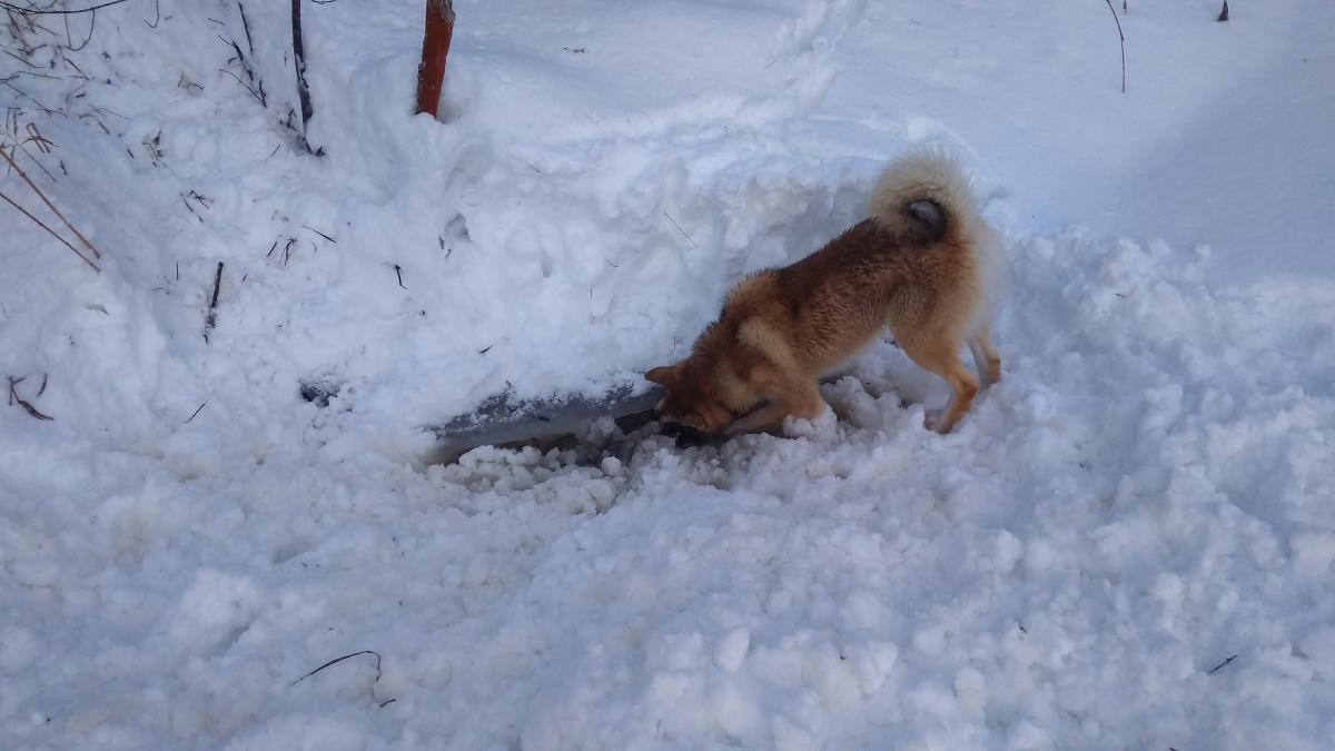 Ездил со щеном в деревню.Заодно пошли посмотреть бобров.Выползы свежие есть.В двух местах аж тропы набиты.Чара все обнюхала,спустилась к выползам у воды.Речушка небольшая по ширине.Пошли с ней по льду.Я на лыжах,она то по лыжне,то впереди.И вот бежит впереди и ..проваливается!И это щенок весом в 5 кг.Подкатываю к ней.Пытается выбраться,но лёд ломается.Хватаю за шкирку,вытаскивают и взад себя её.Чувствую,лыжи начинают оседать.Тоже врубаю заднюю и на разворот.Пообсушил её снегом и рукавицей.Недавно прививку делали,как бы не отразилось купание.Пообсохла.Побегала по буранке,погуляла.