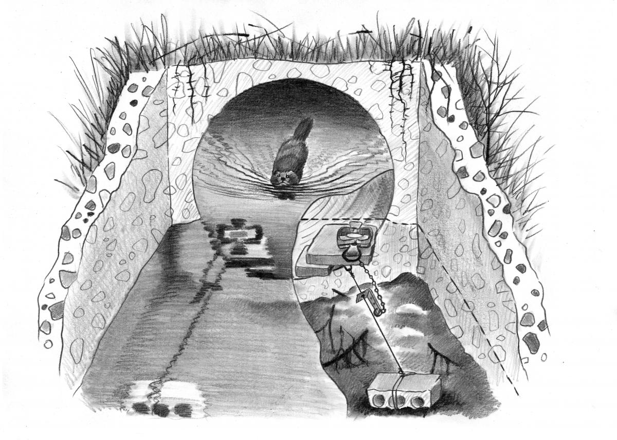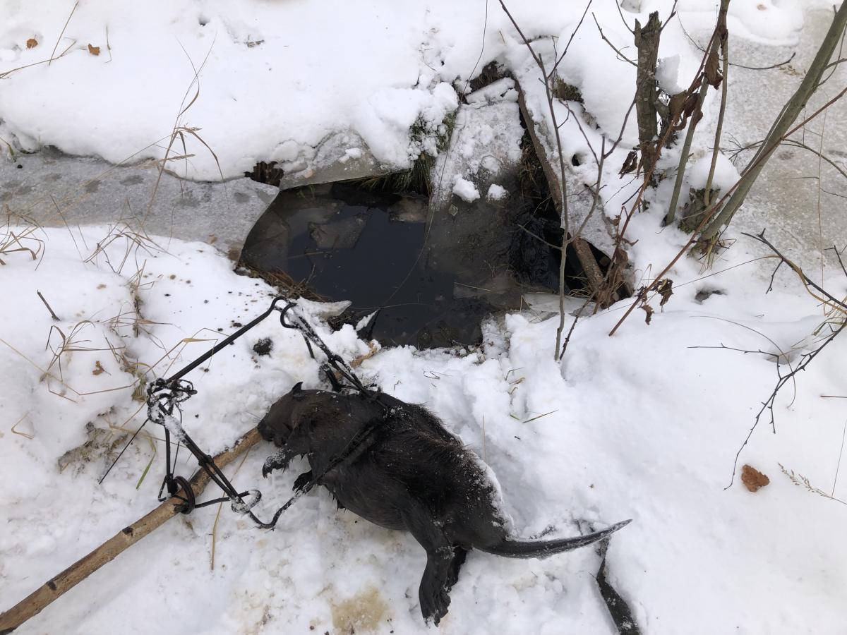 Капканчик поставлен около хатки с приманкой от Андрея Поняги. Капкан стоял в старом вылазе. Бобр попался за заднюю часть (от бриджера хрен уйдёшь). Постановка вся разрушена. За ночь вода, после дождей поднялась на 20-30см в ручье. Видимо из-за этого и утонул.