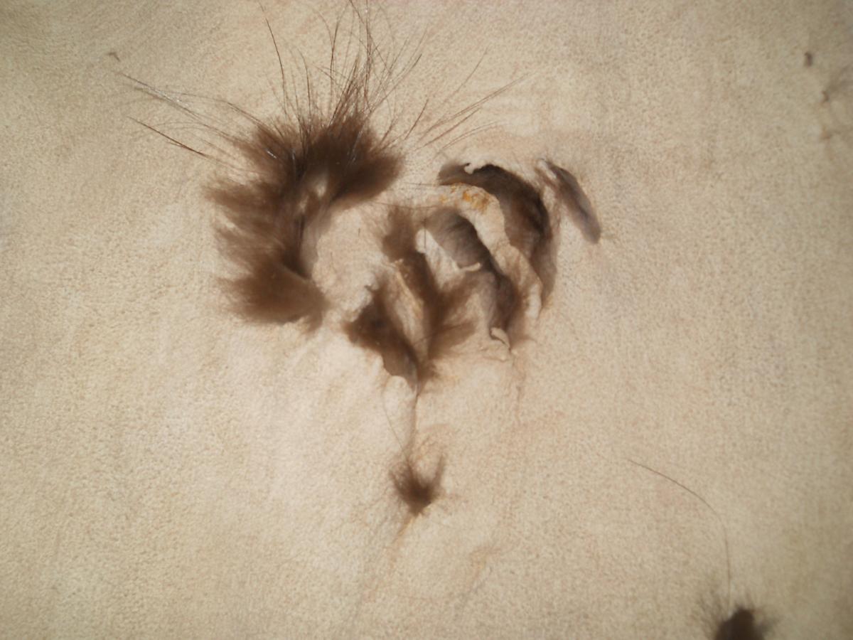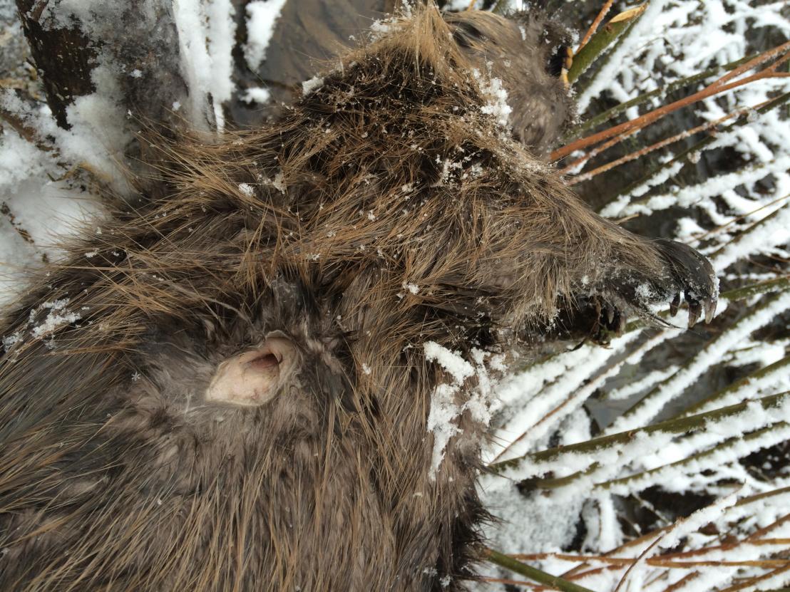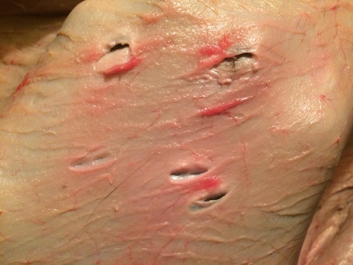 На брюхе обнаружил 2 раны, и сбоку, в районе рёбер, одна. Их увидел сразу. Когда начал снимать увидел ещё 3 укуса на спине. То что это укусы увидел сразу - следы от зубов. А вот от чего на брюхе - не понятно. Может задними лапами (когтями), пока билась. Шкура порвана насквозь.