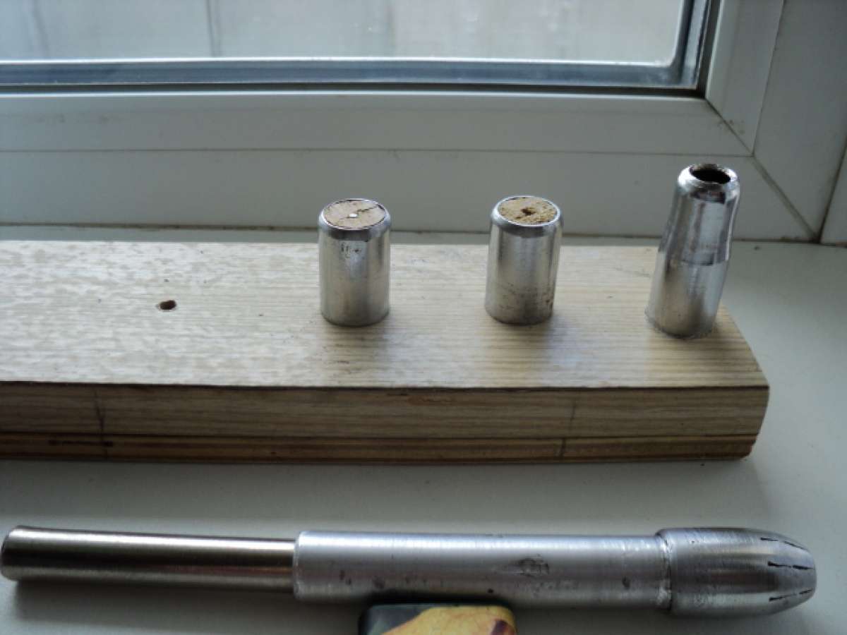 Зачем всё усложнять, кипитить гильзы, греть паяльником, сделайте как описано чуть выше, пост 33. Правка гильзы занимает максимум 5 секунд, от вращения конусной оправки, гильза моментально нагревается, и только успевай одевать разогретые гильзы на цилиндрические оправки. На фото всего 3 цилиндрические оправки, в идеале таких оправок надо 7-10, для непрерывного процесса, выточить можно из любого материала.