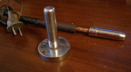 Выточил две латунные оправки. Первая одета на паяльник 60 ватт, в принципе много, достаточно и 30 ватт. Вторая на подставке, для охлаждения. Отполировал и захромировал для меньшего прилипания при перегреве.
