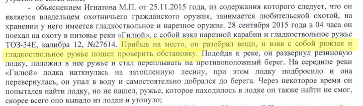 Я расскажу как было дело: после опрокидывания лодки Сергей, чтобы не допустить нарушения действующего законодательства - ни о чём другом он в эту минуту не думал, прижал ружьё к груди и пошёл на дно. Но, через некоторое время потерял сознание из-за недостатка кислорода и очнулся на берегу где-то через сутки, ружья рядом не было.мало данных