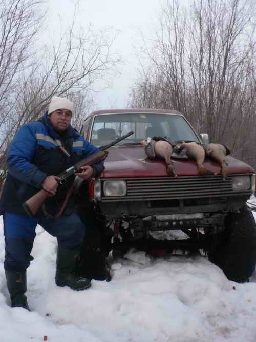 В последний день гусь неплохо шел с утра, с довольно высоко проходящего табуна один был зацеплен, протянул до середины озера, после чего свернулся и камушком вниз. Ехать пришлось на машине, за это время прошло несколько табунчиков, а волшебная дудочка была со мной, потому оставшийся в живых напарник просто провожал их взглядом. Третий трофей был добыт к вечеру, даже и не скажу чей, т.к из-за закончившейся еще вчера вотки, реанимировался и протрезвел наш алкоголезависимый горе-охотник, чем почти удвоилась наша огневая мощь, а табун нашел кучновато, били все примерно в одних и тех же.