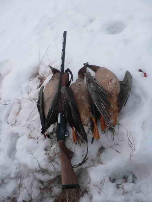 На следующий день гусь пошел с утреца, сначала потихоньку и в основном на эшелоне, но после обеденного перерыва – чаще и ниже. На противоположном берегу обосновался электроманочник, но видимо манок у него был не той системы и я, заявляю это без ложной скромности, своим Faulks-ом довольно успешно переманивал косяки к нам. Такое было впечатление, что у него был просто записан птичий базар, гомон этак нескольких тысяч гусей. Ну это его проблемы, а у меня (нас) они тоже появились. Первая – неумеренное потребление в течение дня одним из напарников этой самой вотки, следствием чего стало очень много более мелких, но не менее противных подпроблем (разбирать их здесь, думаю, не стоит). Вторая проблема – мажу со страшной силой и не могу понять причину. Скорее к ружью новому еще не привык и вообще перерыв в охоте почти год был, да и псих от первой проблемы видимо дает знать. Может где и патроны подводят, т.к несколько раз вижу, что попадаю, но безрезультатно. И вот наконец долгожданный первенец. Табун гуменников, месясь, вывалился из-за мыса, пошел серединой озера, подумал и проигнорировав электроманочника устремился к нам. Маню до последнего, потом хватаю ружье и бью по ближней паре, сначала по дальнему – вижу, что попал и переношу огонь на второго. Так и не понял, почему он полетел дальше, хочу добавить, но осечка. А первый все еще продолжает падать, раскинув крылья и вращаясь как кленовое семечко. Упал и замер, распластавшись на белоснежном снегу, обрызгав его кровью. Вот она первая дичь моего «Бекаса»! Экземпляр кстати попался не хилый, антропометрические данные (если это выражение к гусям можно применить) составили вес – 4,2 кг, размах крыльев около 1,4 м. Нашел осечечный патрон, капсюль набит нормально. Кстати осечки повторялись еще дважды, один был также нормально наколот, а на капсюле третьего – никаких следов (патрон был старый с белым капсюлем, в ОиОХ как-то писали, что часто сними такое бывало). А возможности были упущены отличные, оба раза эти патроны были в стволе и гуси налетали великолепно, но пока передернешь – увы, улетели уже.