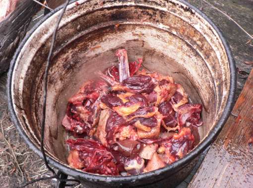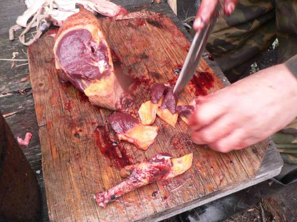 Други тоже скоро подходят, перекусываем. Погода портится окончательно, пошел снег с мелким градом, ветрюган гнет деревья к земле, все озеро в барашках. А мы начинаем священнодействовать – готовить рагу Анды. Пара турпанов разделывается особым образом, мякоть срезается и нарезается небольшими кусочками. На косточках тоже чуть мяса остается.