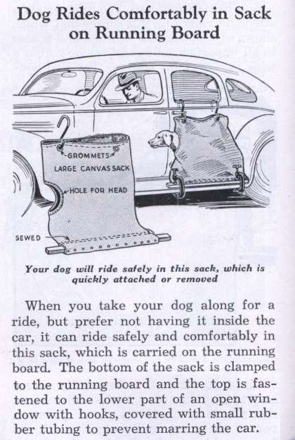 Dog Rides Comfortably in Sack on Running Board (Jun, 1936). Когда вы берете с собой в поездку собаку, но предпочитаете, чтобы она не находилась в салоне машины, она сможет комфортно и безопасно ехать в таком мешке, стоя на боковой подножке. Дно мешка прикрепляется зажимами к подножке, а верх крепится к оконному проему крючками, покрытыми резиновой трубкой, чтобы не повредить машину.